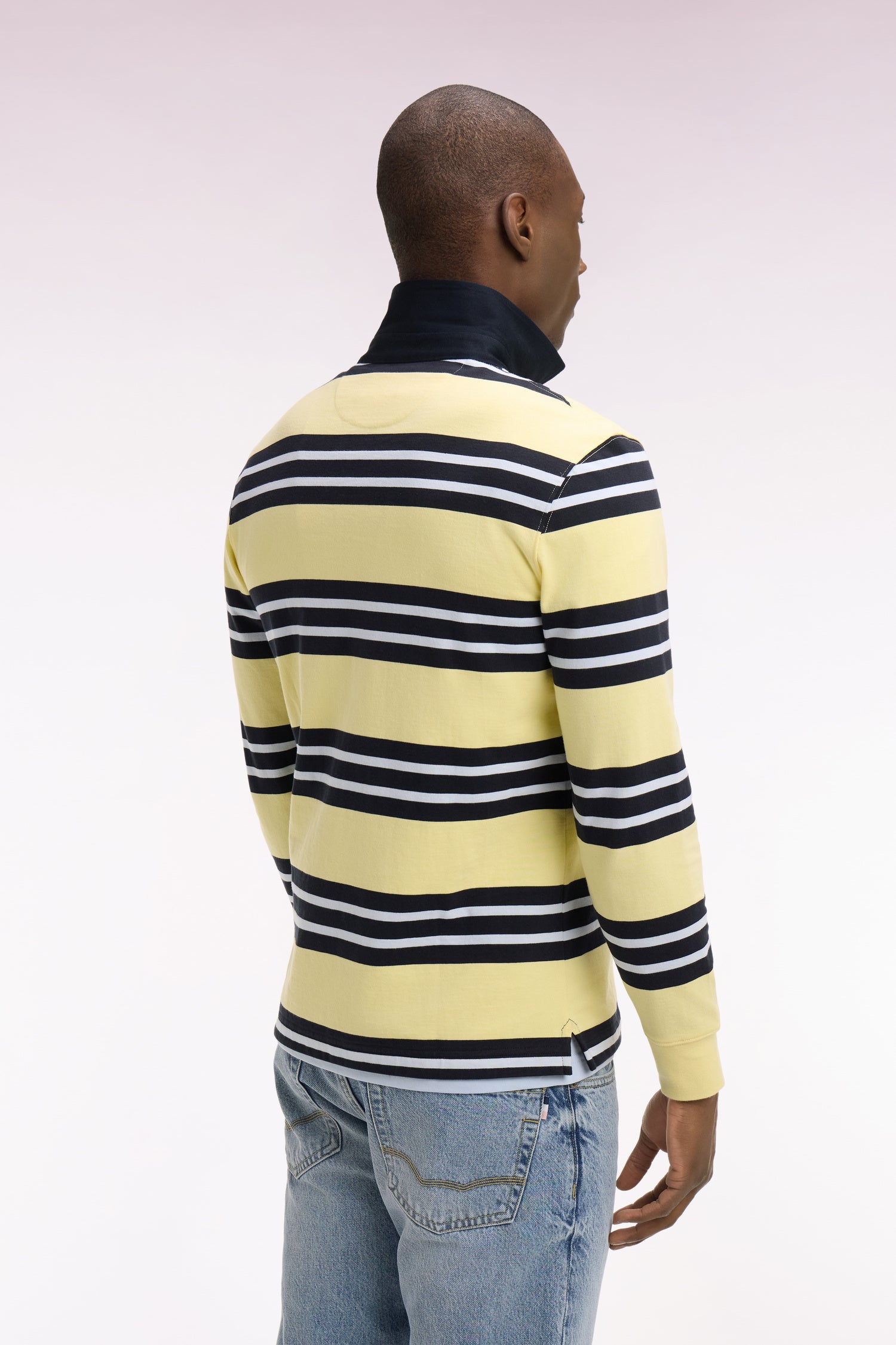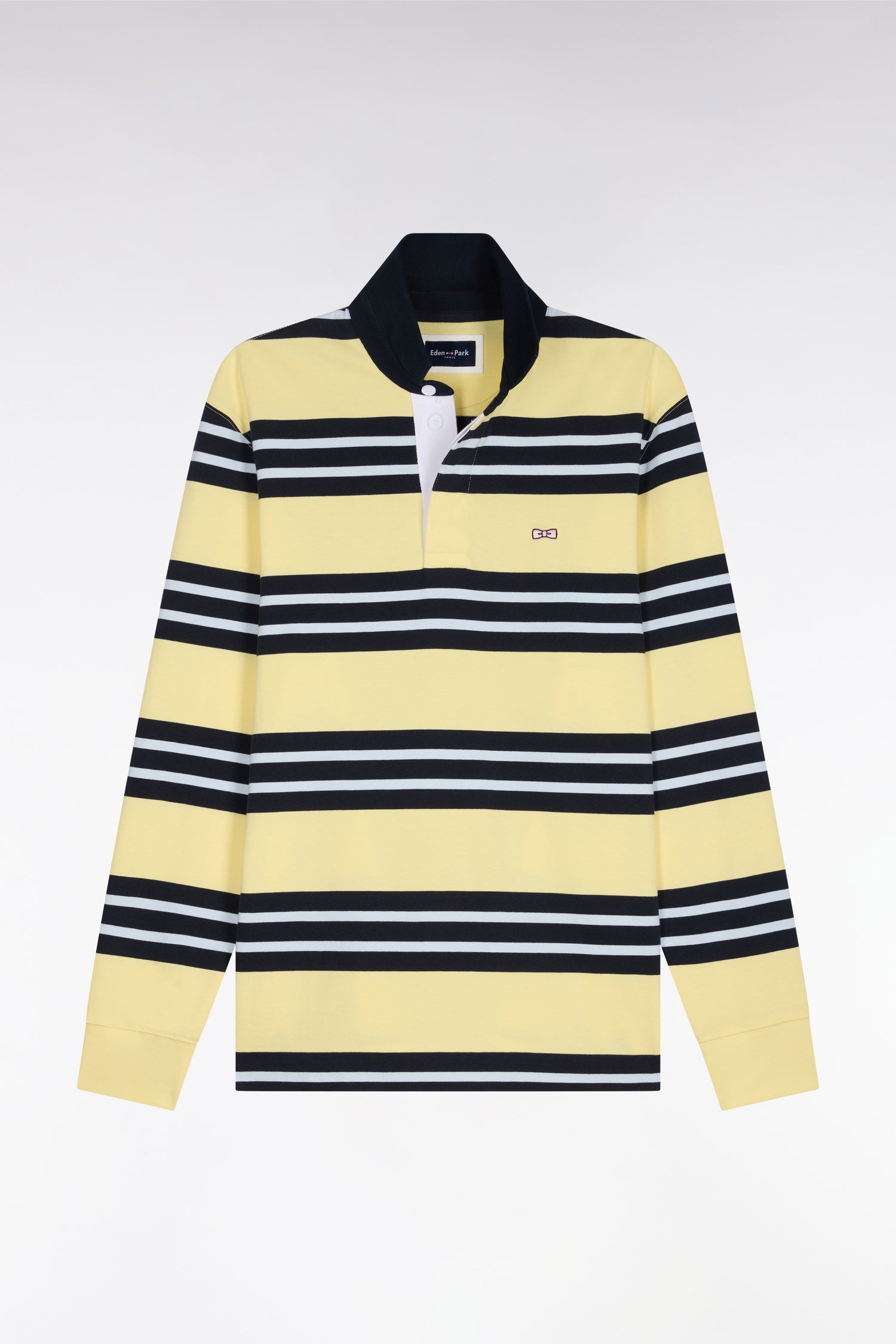 Ce maillot de rugby rayé revisite un grand classique du vestiaire Eden Park avec une élégance contemporaine. Ses rayures fines et équilibrées jouent les contrastes subtils, tandis que le coton choisi pour ce maillot à manches longues garantit confort et tenue impeccable saison après saison. Une pièce proposée dans deux duos de coloris, jaune clair ou vert aqua, parfait mélange d’esprit sportif et de raffinement urbain.