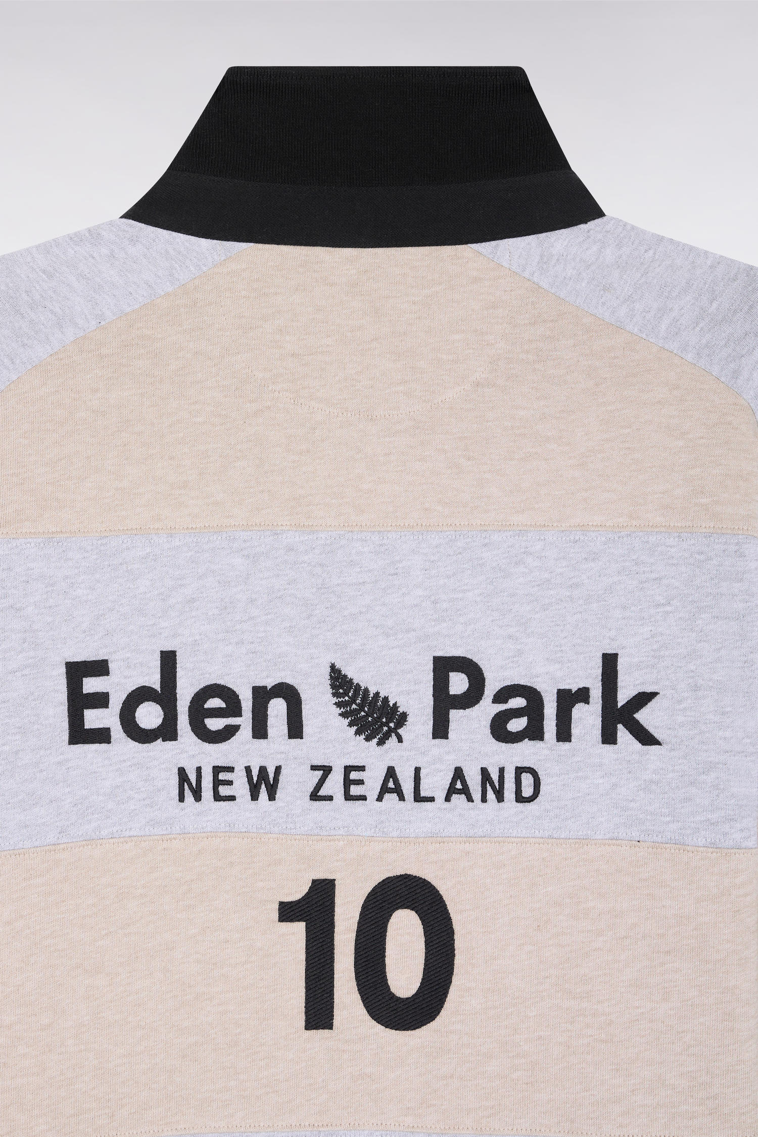 En noir et gris ou gris et beige, ce maillot à manches longues en jersey épais à la coupe ample revisite l’esprit des tenues de rugby avec ses rayures coupées-cousues et son design affirmé. Le dos est orné d’une broderie New Zealand signature, tandis que les finitions contrastées en twill et bords-côtes renforcent son style sport chic hommage à la Nouvelle Zélande, terre de prédilection du rugby. Un modèle à porter avec un jean ou avec son jogging coordonné