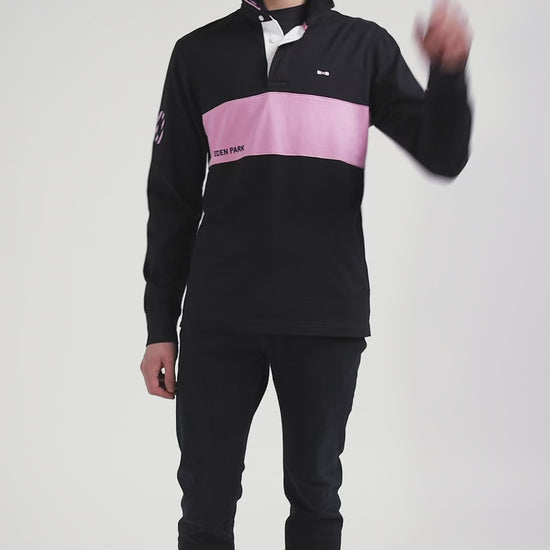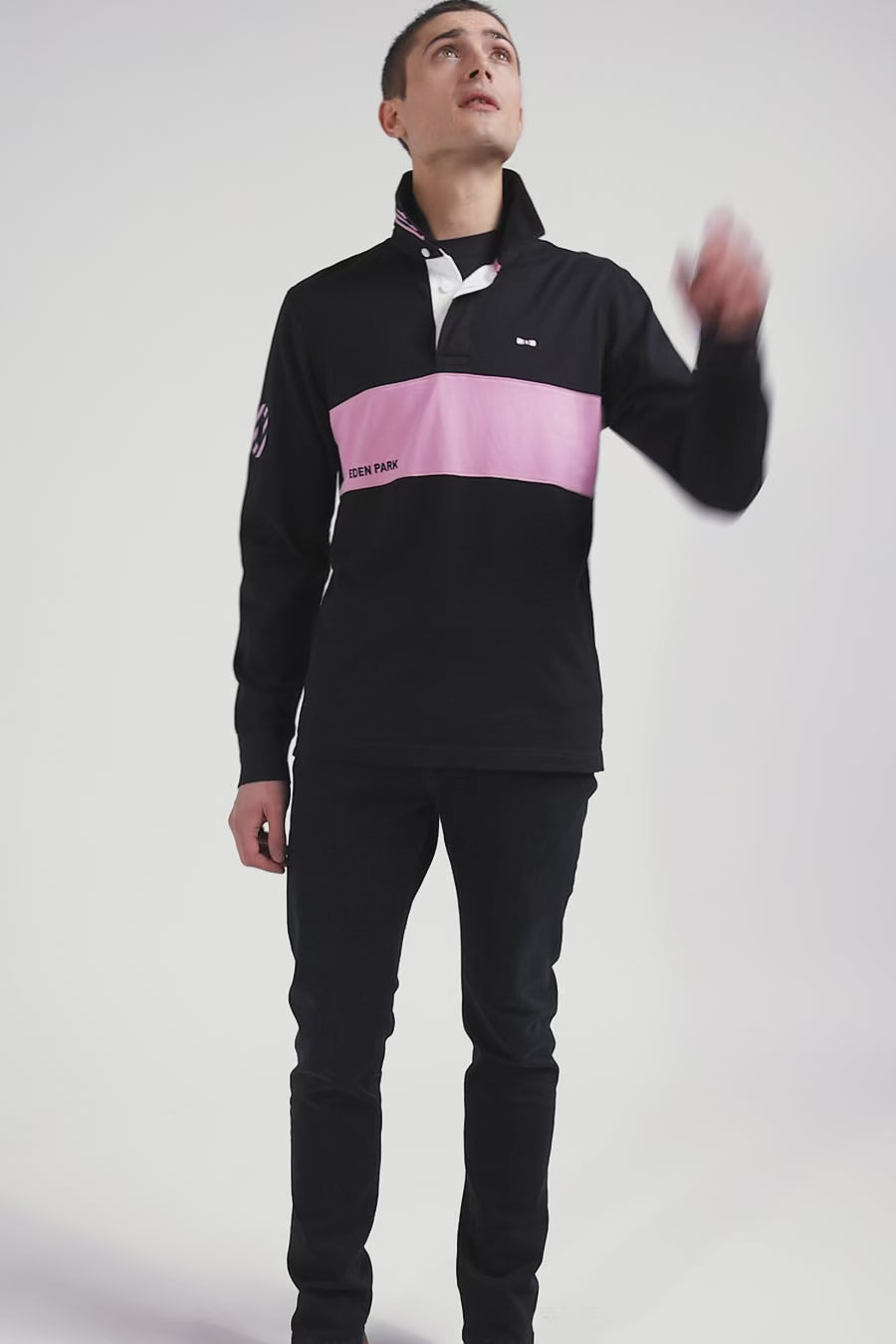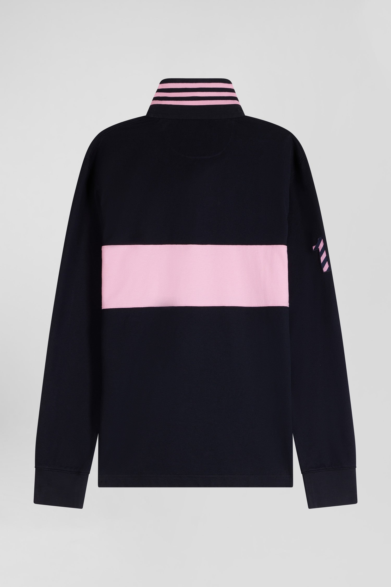 L'iconique maillot homme en jersey de coton arbore ici tous les codes de notre Maison. Le coton doux marine est réhaussé d'une large rayure rose, rappel de ses finitions emblématiques aux couleurs Eden Park comme la broderie nœud papillon rose, sa manche portant le numéro 10 et son dessous de col cerclé.