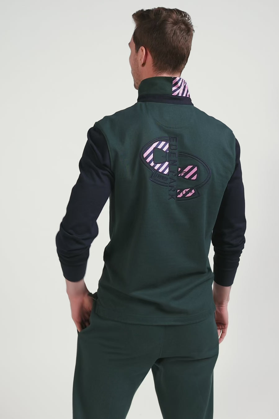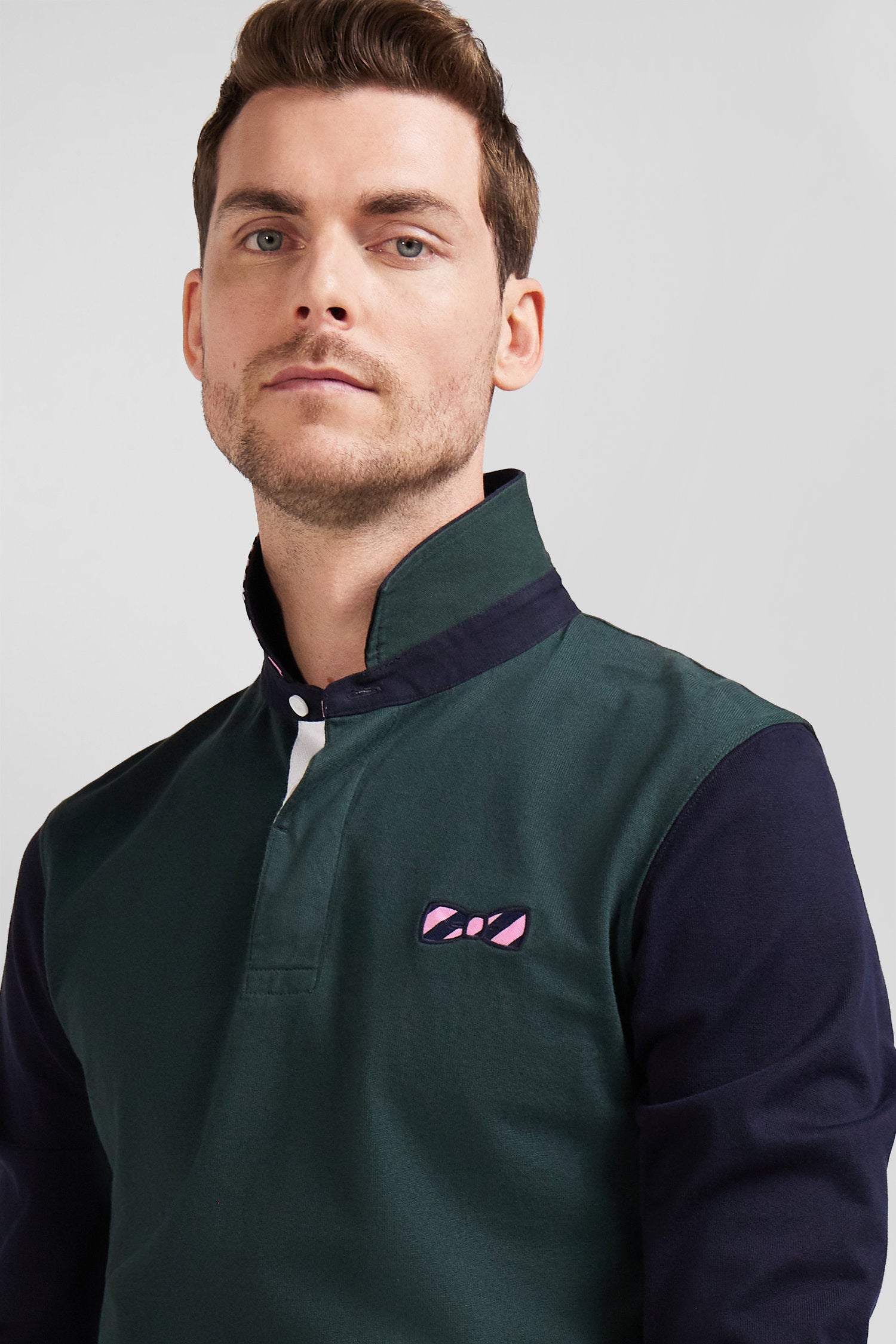 Ce maillot pour homme, aux manches longues et à la coupe Regular droite, conjugue confort et allure avec son jersey de coton doux au porté. Le col polo, dont le dessous est doublé sur sa moitié d'un tissu cravate cerclé, et sa broderie emblématique dans le dos incarnent l'ADN et la touche French Flair du vestiaire Eden Park. Rappel subtil, sa broderie nœud papillon sur la poitrine se fait légèrement plus visible et arbore elle aussi les rayures marine et roses si caractéristiques de l'esprit de nos collections.