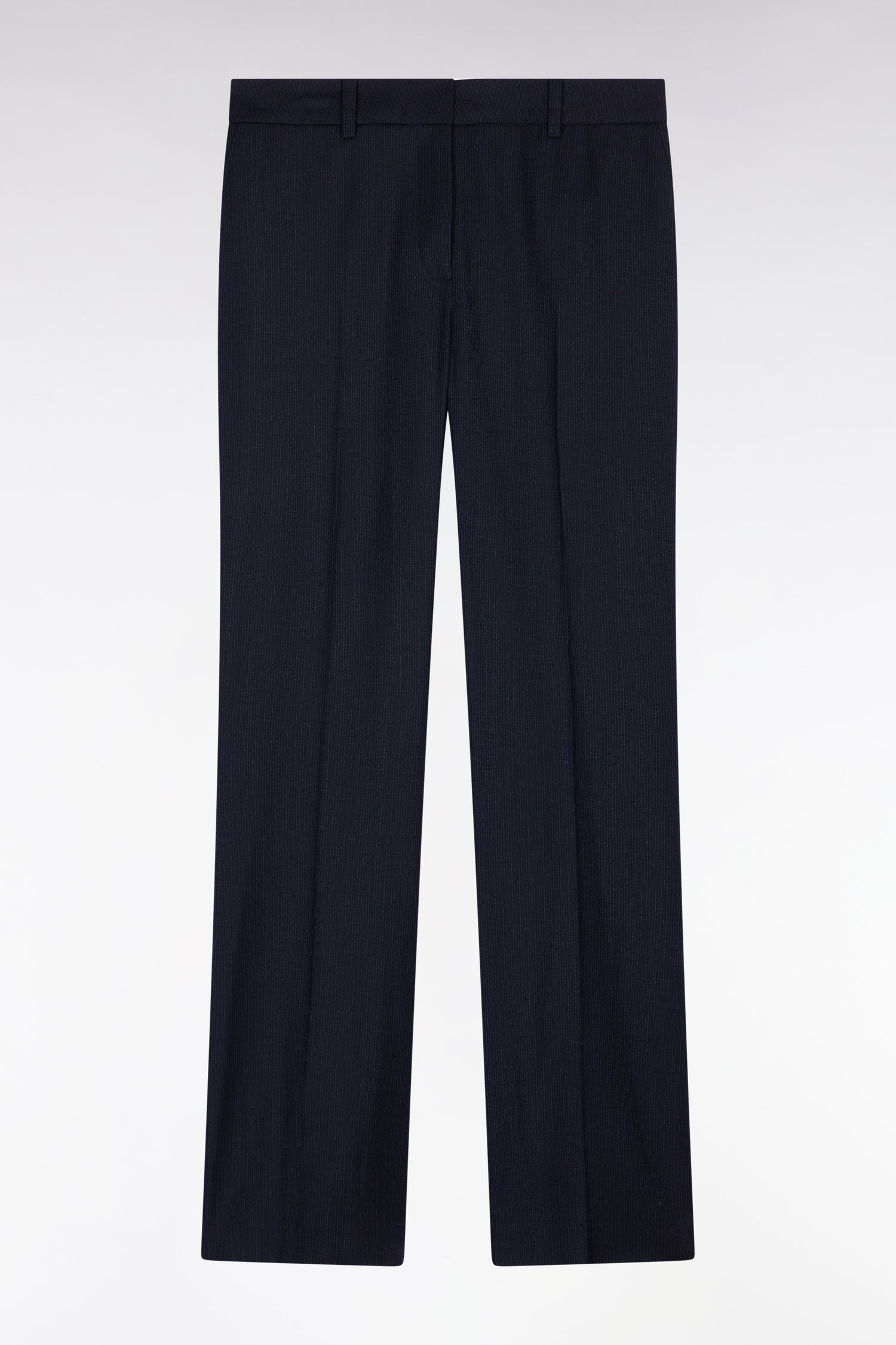 Esprit tailoring et ligne affûtée pour ce pantalon à la coupe flare réalisé en flanelle rayée marine. Sa coupe légèrement évasée sublime la silhouette, tandis que ses rayures milleraie ton sur ton lui confèrent une allure raffinée. À porter avec la veste double boutonnage assortie ou un pull à col roulé pour un ensemble au chic intemporel du matin jusqu'au soir