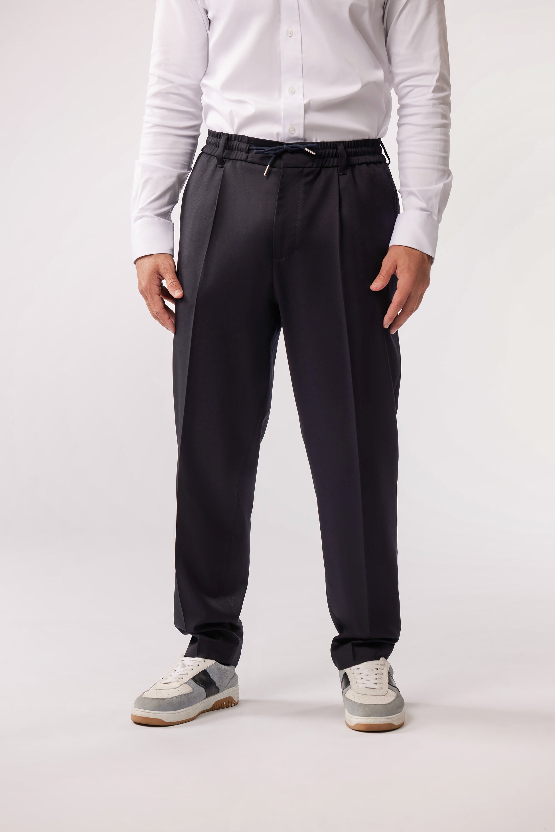Ce pantalon en laine revisite les codes du tailoring avec une approche contemporaine et décontractée. Issu de la capsule exclusive Eden Park x Racing 92, il s’inspire de l’univers « Club House » en mêlant élégance et confort. Sa taille élastiquée avec cordon de serrage et sa coupe fluide en font une pièce polyvalente, idéale pour un vestiaire chic au quotidien, entre allure formelle et esprit casual.
