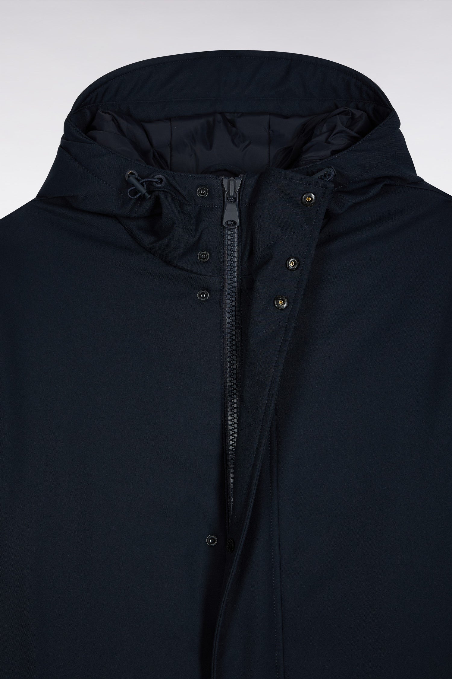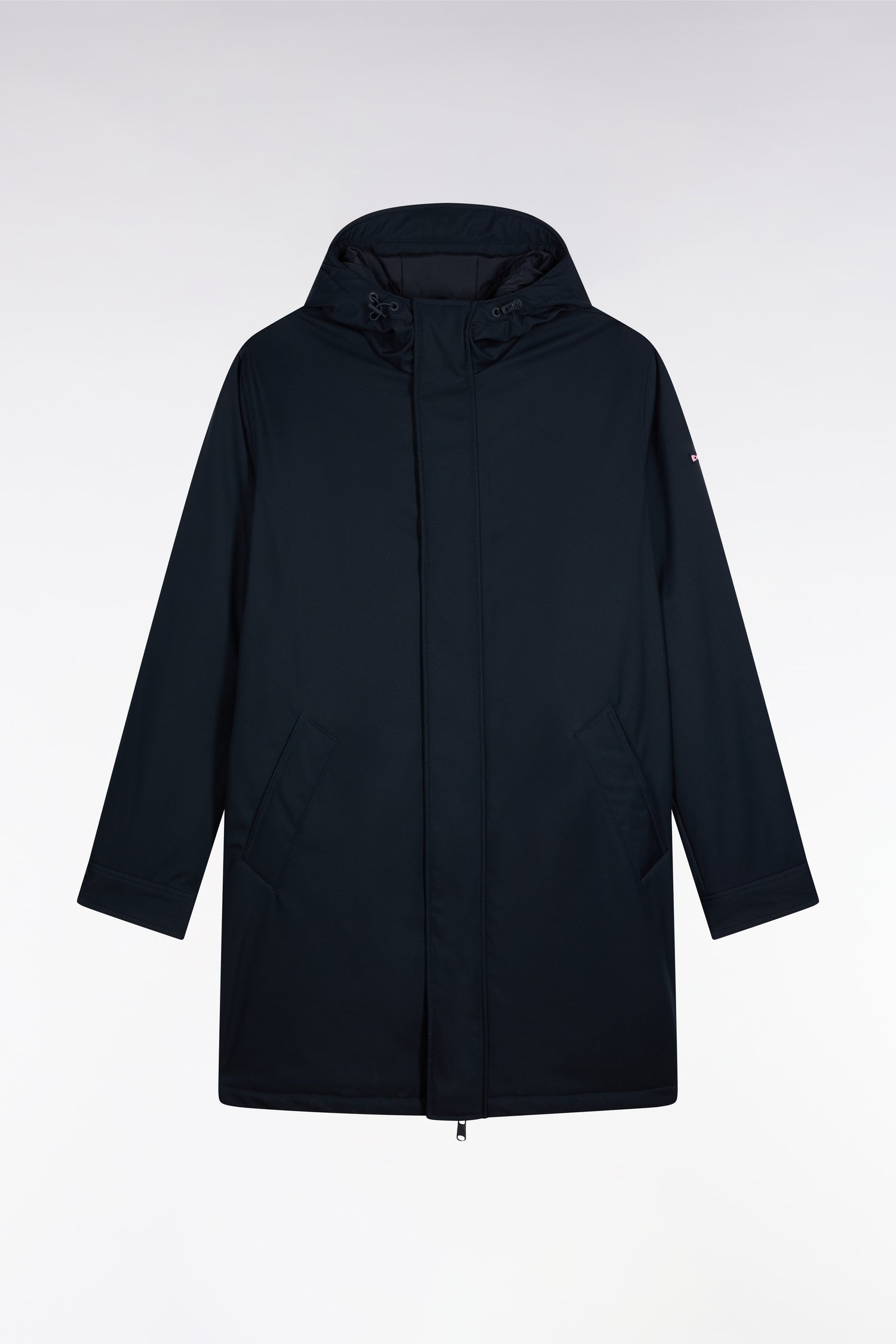 Déclinée en marine, kaki ou noir, cette parka longue en nylon mat incarne l’équilibre parfait entre sobriété urbaine et protection contre les éléments. Son matelassage intérieur offre un confort thermique idéal pour la mi-saison comme pour l’hiver. Sa silhouette s’ajuste grâce à un lien de serrage discret dans le dos et à la capuche. Le zip à double curseur dissimulé sous la patte de boutonnage, les poches pratiques et les finitions iconiques renforcent l’allure fonctionnelle et raffinée de cette parka masculine dotée de fournitures soft touch