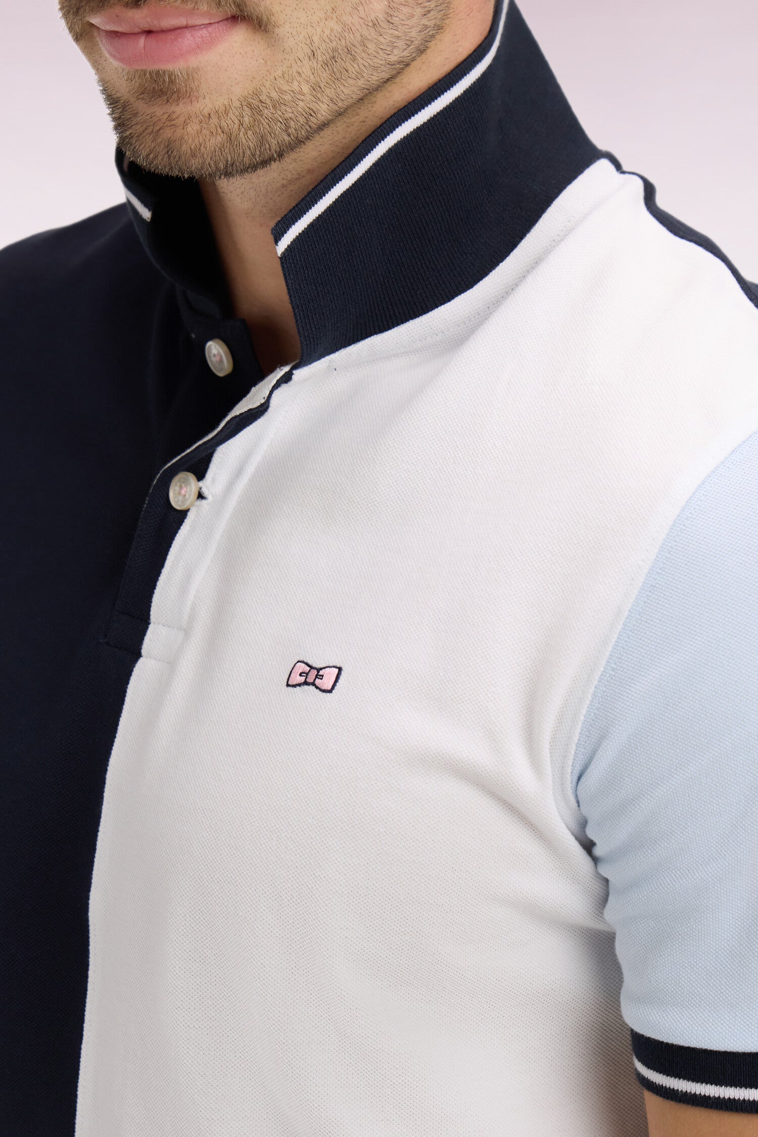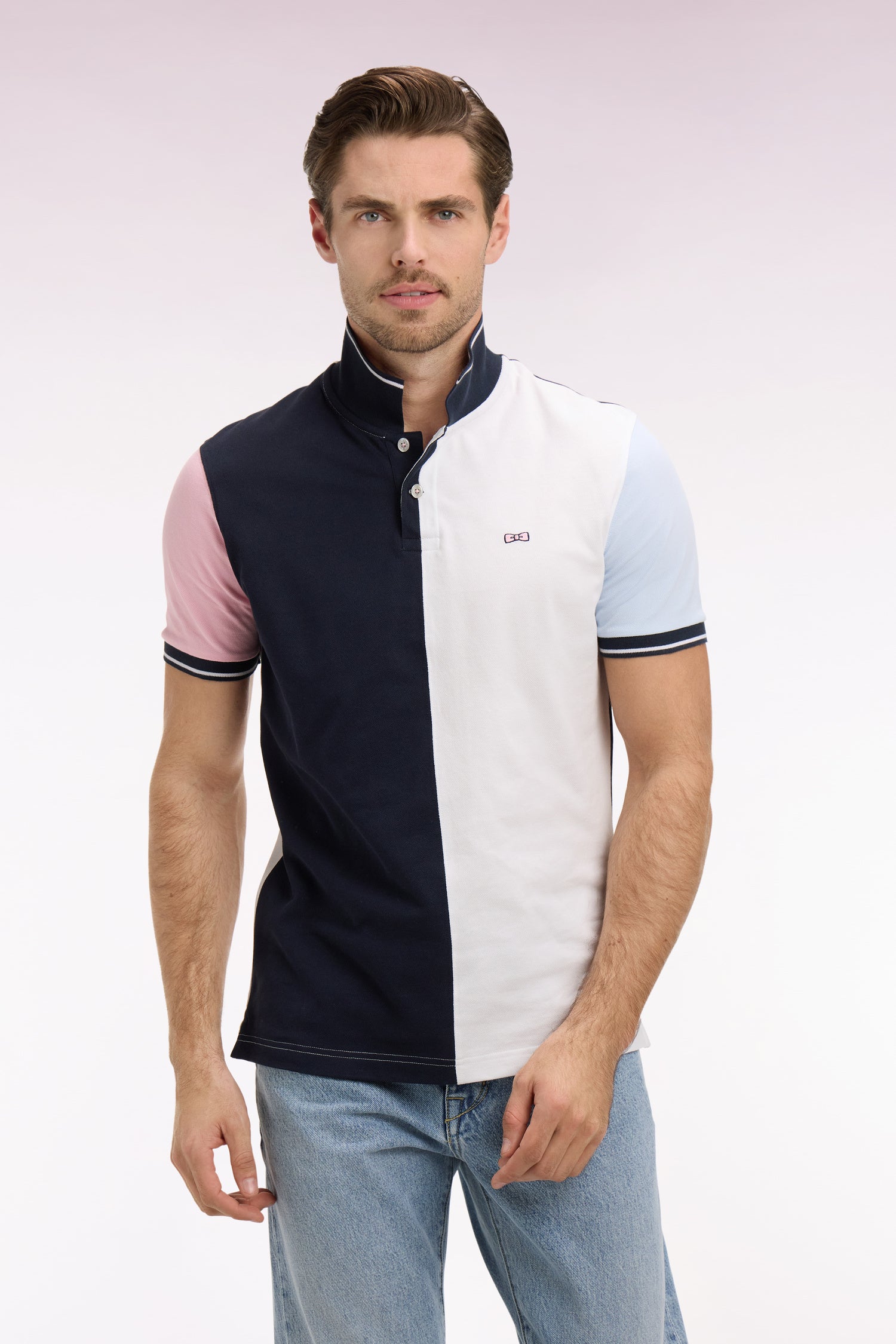 Ce polo en coton se distingue par ses manches contrastées et ses découpes verticales marine et blanc. Son col marine est souligné d'un liseré blanc, rappel de ses bordures de manches. La broderie nœud papillon rose Eden Park complète cette pièce sport-chic à la coupe droite classique, idéale pour la saison.
