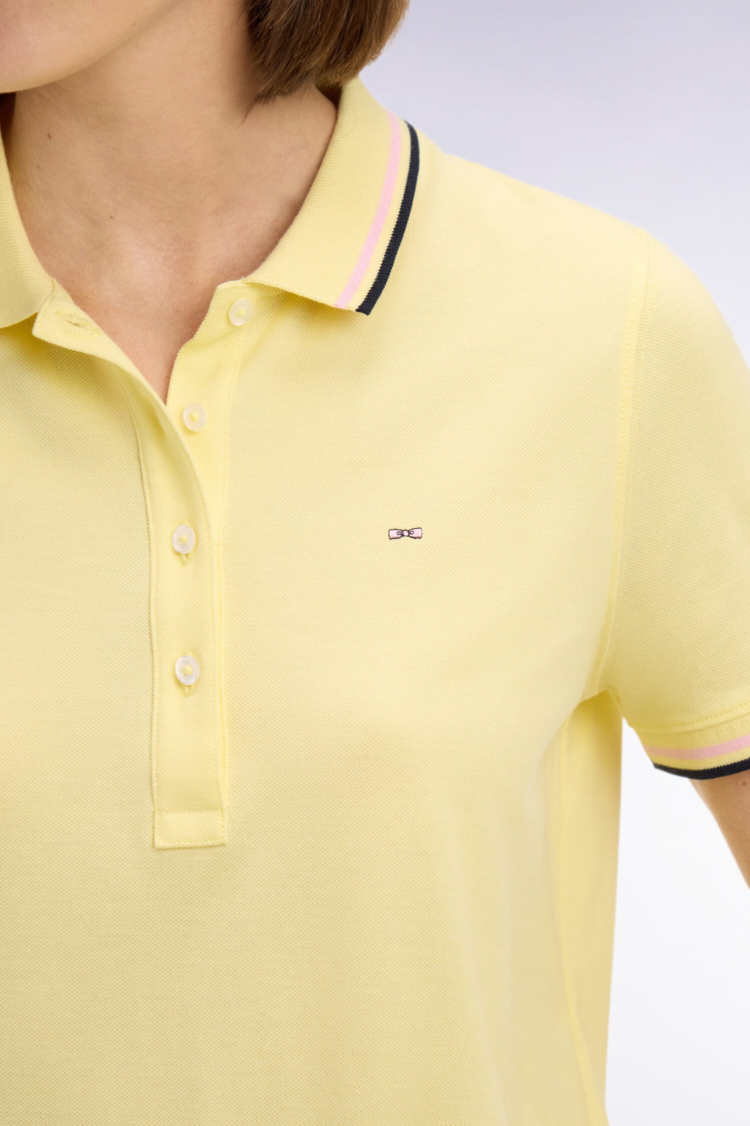Ce polo à manches courtes en pur coton s’impose comme un incontournable du vestiaire féminin grâce à sa coupe droite confortable et son style sport chic assumé. Son emblème nœud papillon brodé sur la poitrine et ses finitions en bords-côtes à fines rayures au col et manches apportent une touche subtilement sportive et féminine. Décliné en plusieurs coloris doux ou plus contrastés, ce polo femme s’associe naturellement à un jean droit, un bermuda tendance ou pourquoi pas à notre jupe courte en denim pour une allure urbaine plus travaillée. Ce modèle est également offert dans une coupe slim plus ajustée pour s'adapter à toutes les envies et morphologies.