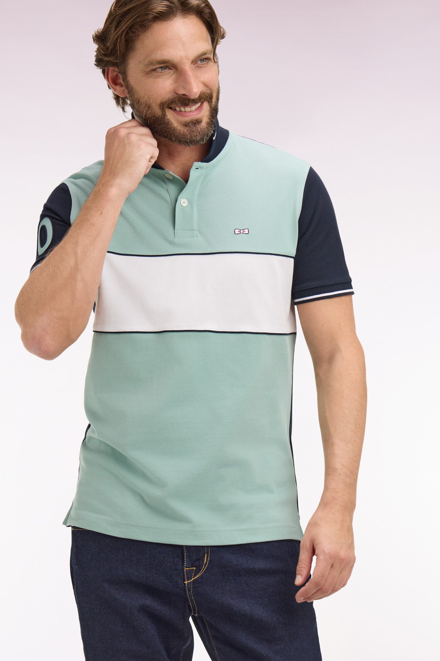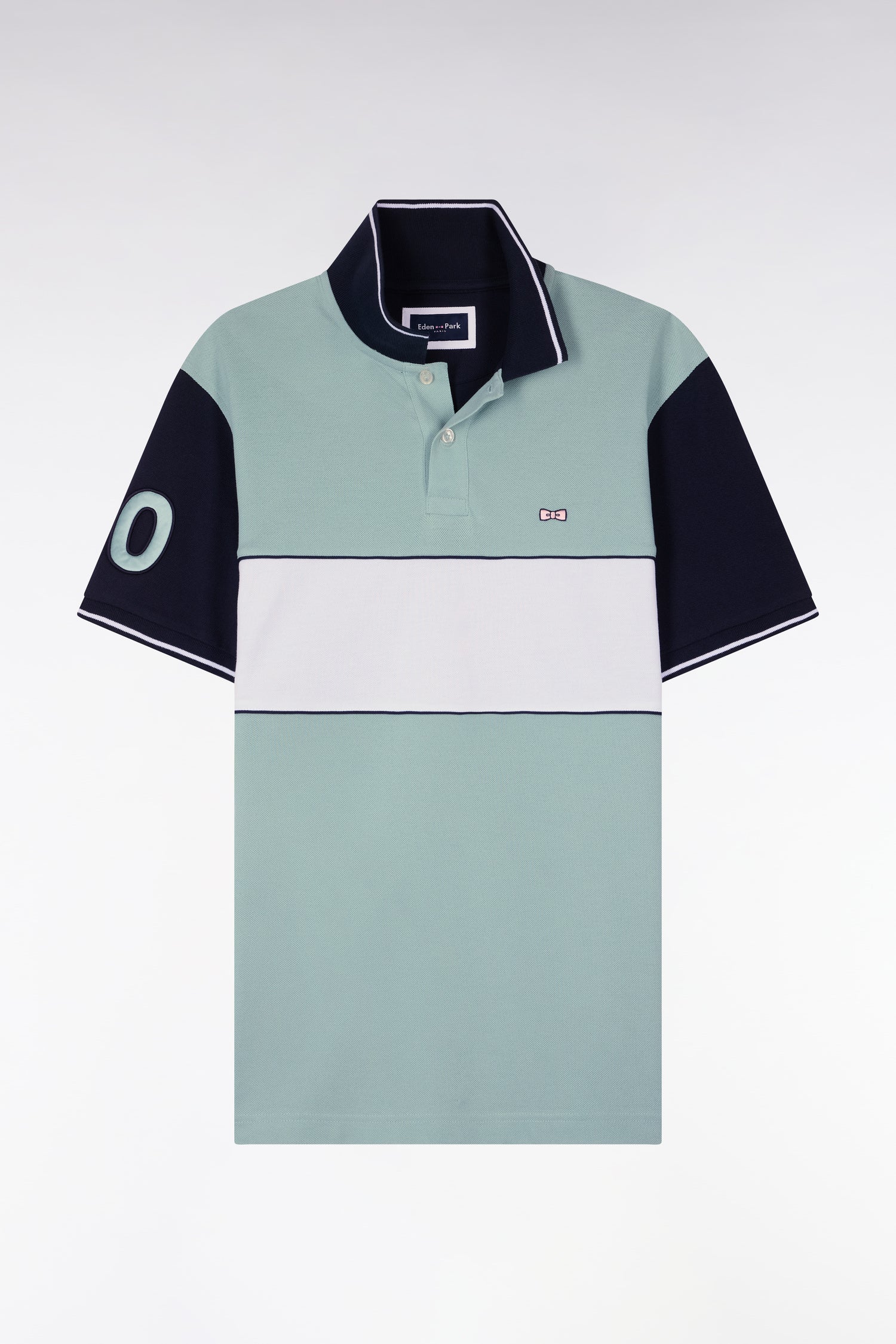 Ce polo masculin en piqué de coton coupe regular célèbre l’ADN rugby de la Maison grâce à sa large bande poitrine blanche, soulignée de passepoils marine qui structurent la silhouette. Le nœud papillon brodé et la broderie 10, enrichie d’une application en tissu cravate, renforcent son caractère identitaire. Son col et ses bas de manches en bords-côtes tricotés sont rehaussés d’un liseré contrasté, pour une touche élégante et sportive. Décliné dans les 4 coloris pastel signature de la saison, toujours associé à l'intemporel marine, ce polo à manches courtes incarne la modernité et la polyvalence du vestiaire sport chic Eden Park.