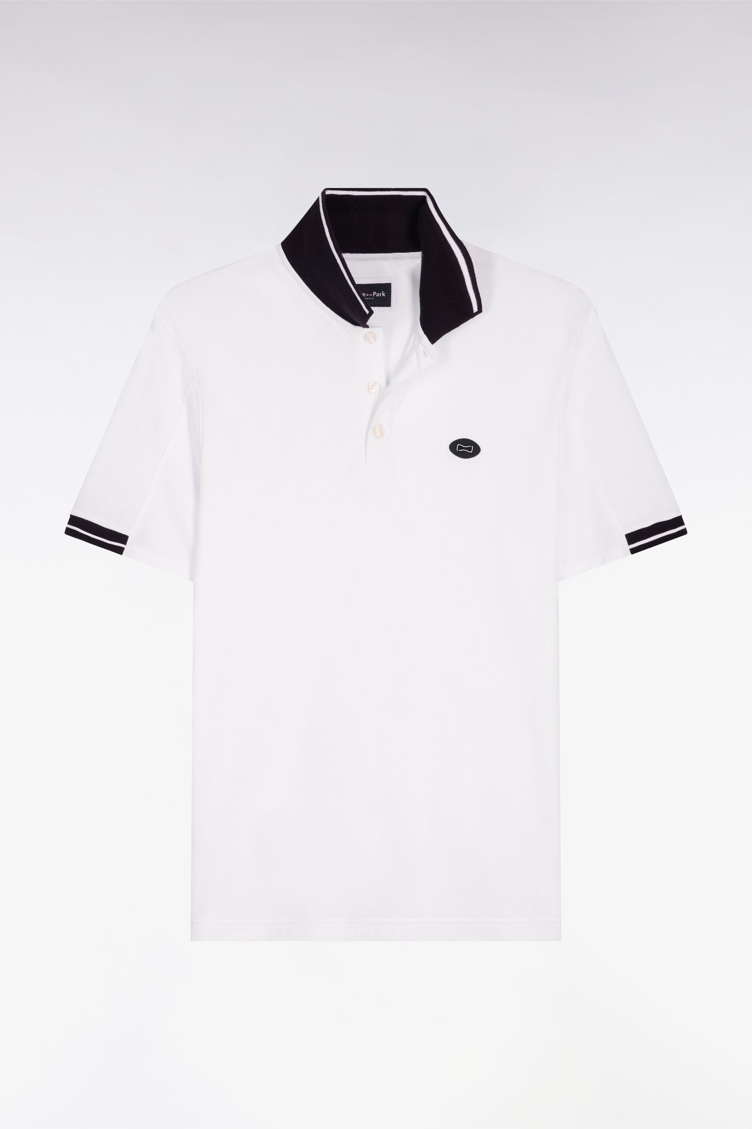 Ce polo à manches courtes en piqué de coton blanc ou marine se distingue par ses bords-côtes bicolores en bordure de manche. Il présente un col polo marine à rayure contrasté qui met en valeur le port de tête. Ce modèle typique du vestiaire masculin Eden Park, alliant élégance et esprit rugby, est agrémenté d'un badge ovale sur lequel reconnaitre l'emblème de la Maison : le nœud papillon rose.