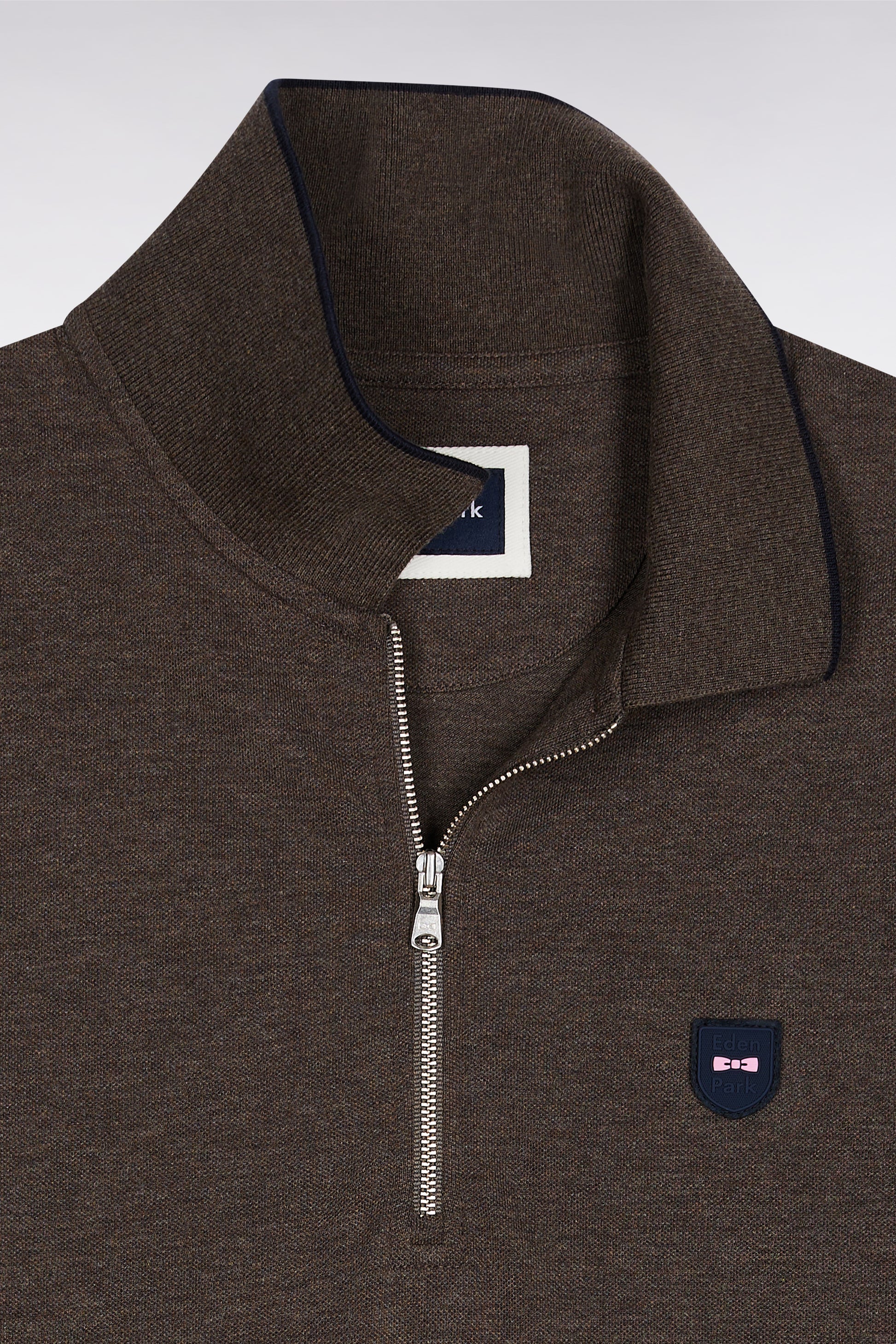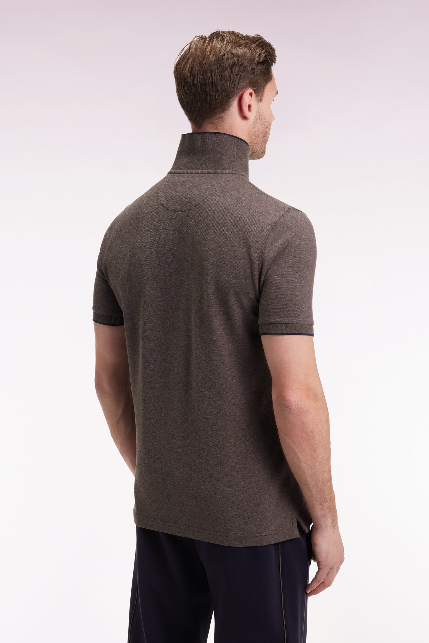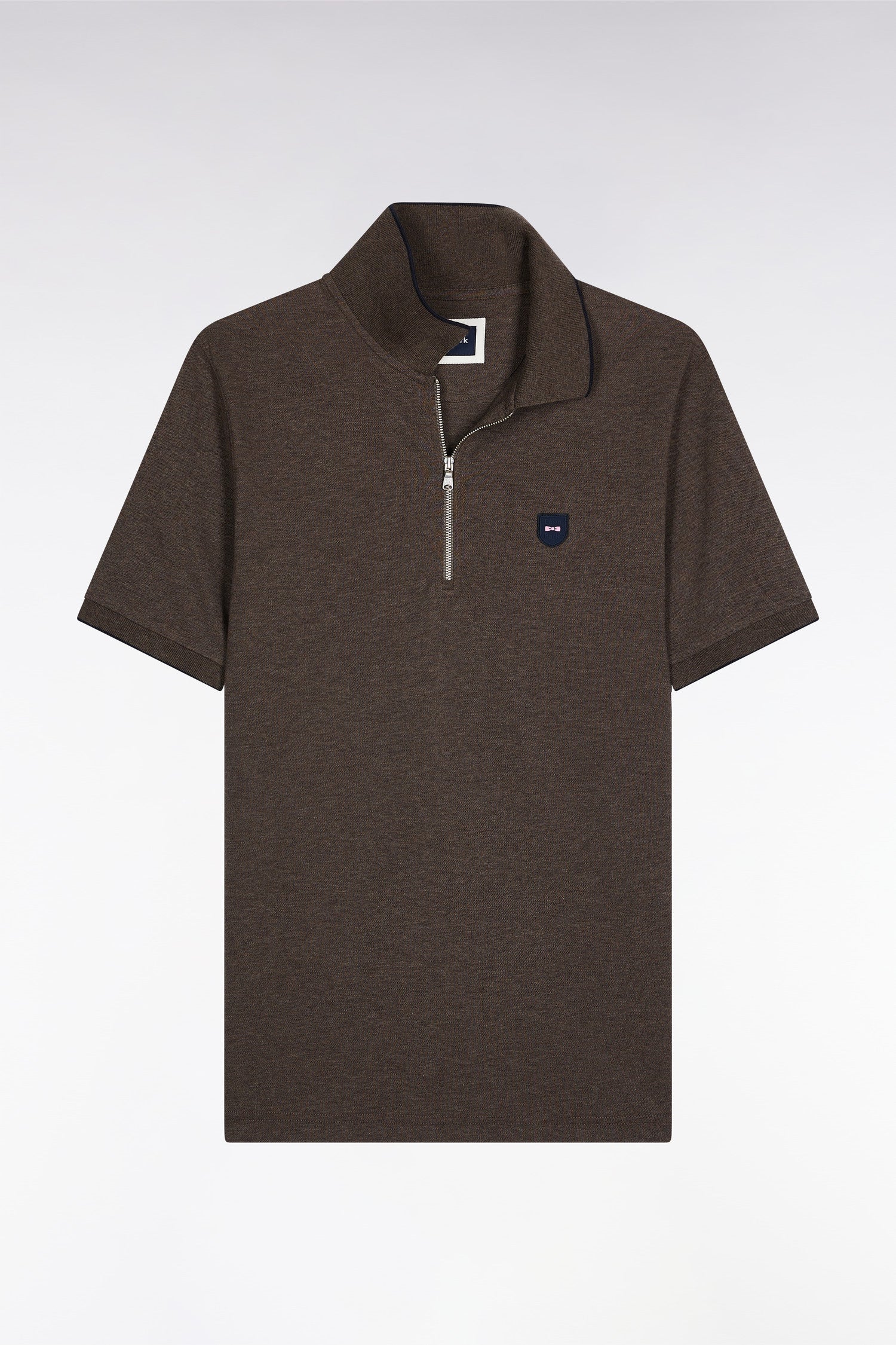 Polo manches courtes en piqué coton stretch marron zippé coupe slim