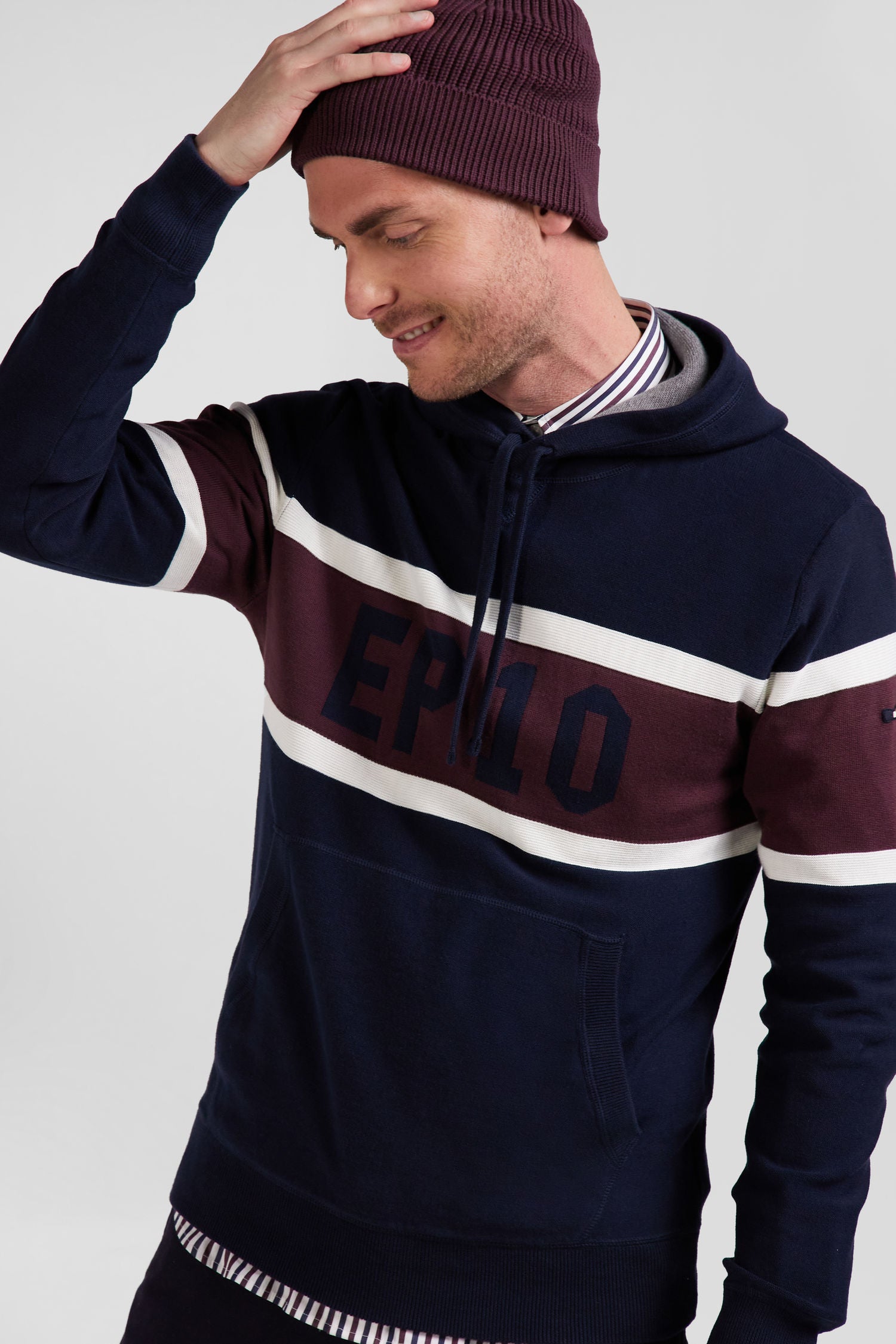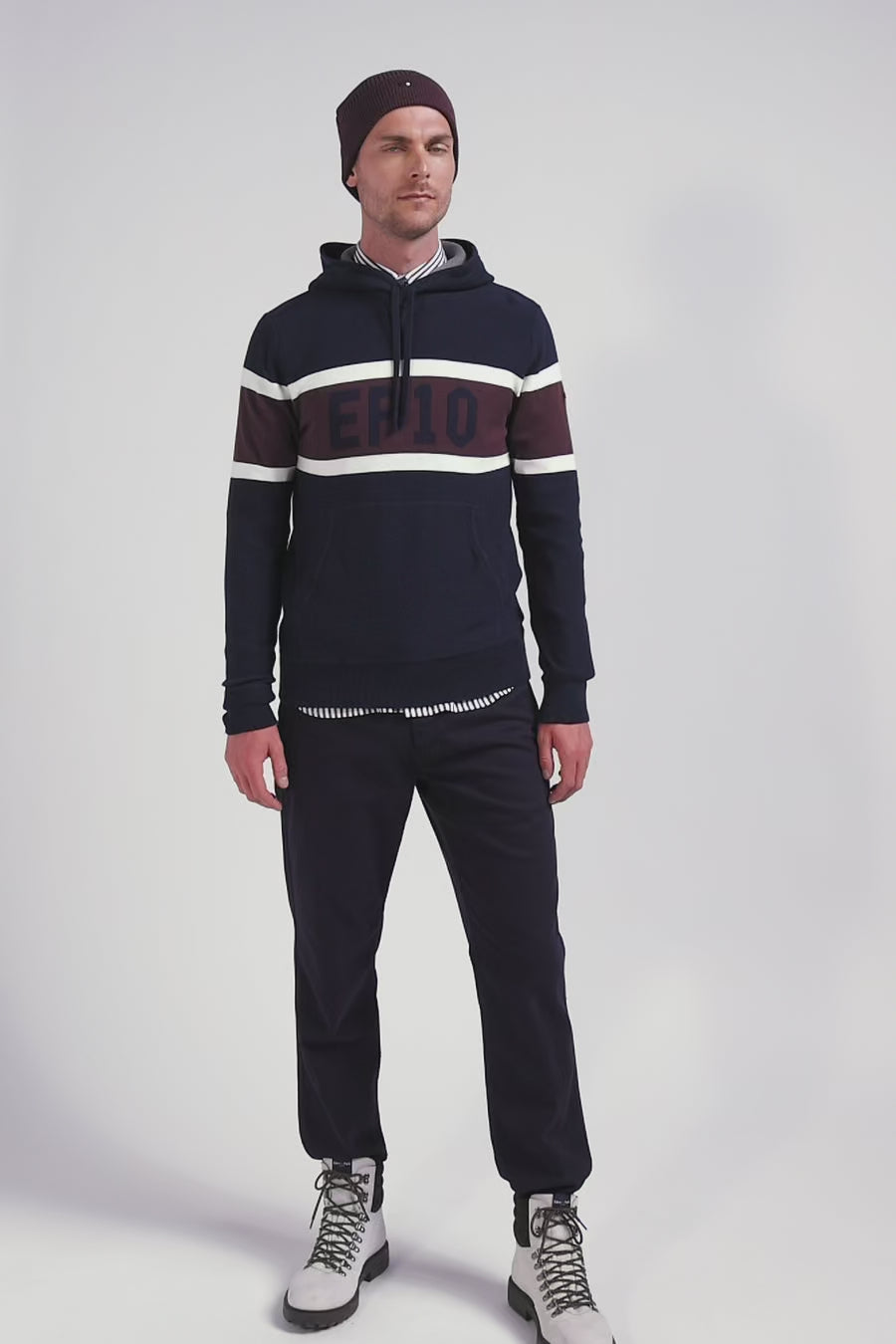 Travaillez vos tenue décontractées avec ce pull à capuche qui marie habilement des jeux de maille contrastés pour un effet visuel dynamique. Sur la poitrine, une bande en jacquard met en valeur le logo EP 10. Inspiré du sweatshirt avec ses finitions en bords-côtes, sa capuche intégrée, son corps en jersey et sa demi-lune en jersey envers, ce pull est l'alliance parfaite du style et du confort.