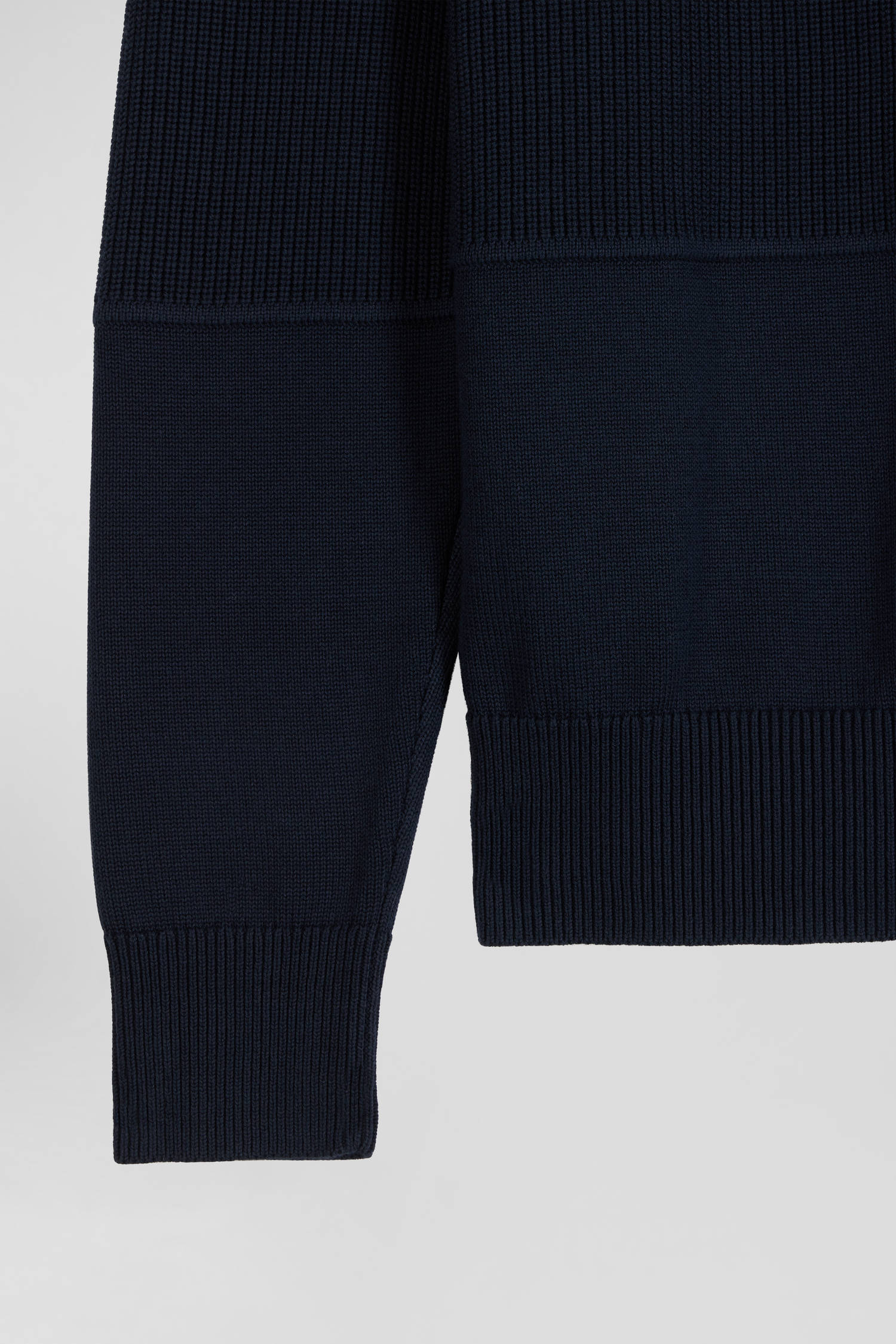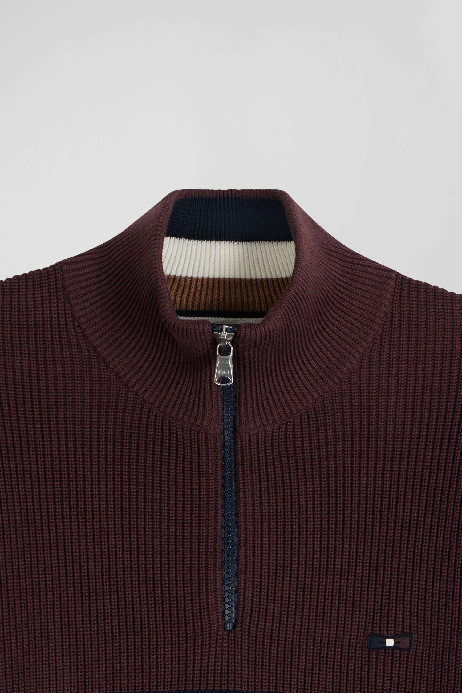 Élégance et originalité se fondent dans ce pull zippé à col camionneur. Ses rayures intérieures contrastées et la demi-lune en jersey sont rehaussées par un ruban tricoté tricolore, pour une touche discrète de sophistication. Le jeu des côtes perlées alternant avec le jersey crée un effet trompe-l’œil saisissant, évoquant un style coupé-cousu contemporain rendant hommage aux maillots de rugby et à leur confection particulière. Cet essentiel masculin revisité est parfait pour une allure raffinée et décontractée à la fois.