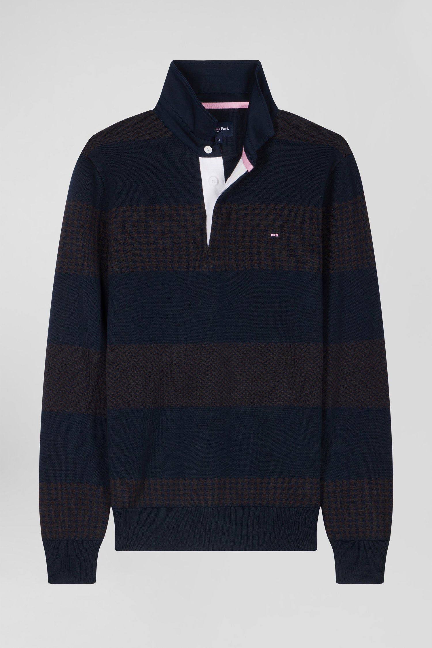 Pull col maillot en coton marron cerclé coupe Regular jacquard pied-de-poule