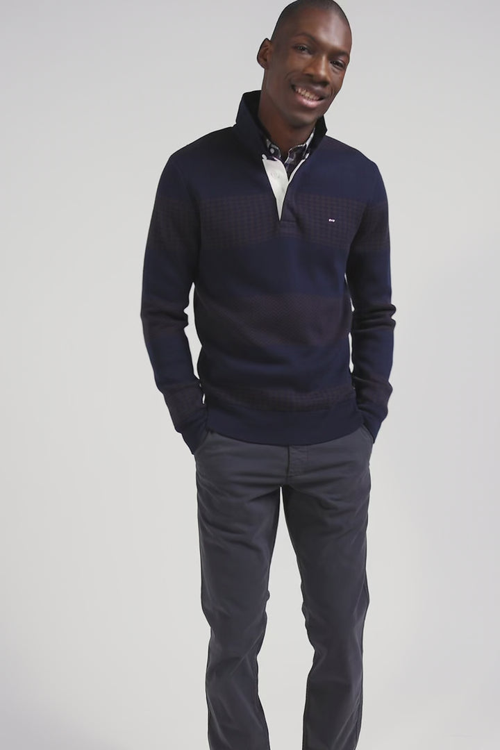 Ce pull homme en coton présente un col maillot en twill et un design inspiré des maillots cerclés de notre Maison. Ici, les rayures alternent entre le motif pied-de-poule et le jacquard uni. Cette association créative offre une dynamique visuelle unique. Le col maillot est sublimé par une broderie nœud papillon à l'arrière, complétée par une application de tissu cravate pour une signature distincte. Le dessous de patte de boutonnage en ruban blanc vient parfaire ce pull homme, alliant tradition et modernité avec brio.