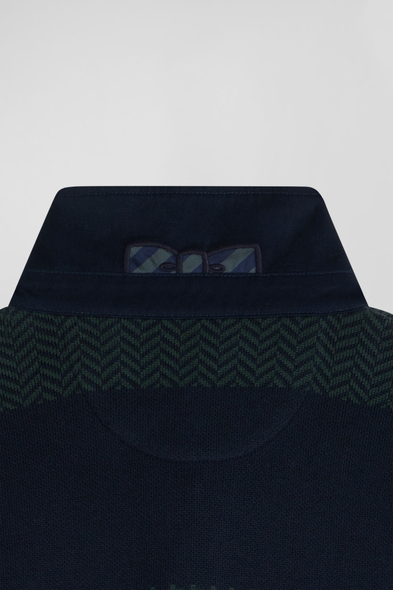 Ce pull homme en coton présente un col maillot en twill et un design inspiré des maillots cerclés de notre Maison. Ici, les rayures alternent entre le motif pied-de-poule et le jacquard uni. Cette association créative offre une dynamique visuelle unique. Le col maillot est sublimé par une broderie nœud papillon à l'arrière, complétée par une application de tissu cravate pour une signature distincte. Le dessous de patte de boutonnage en ruban blanc vient parfaire ce pull homme, alliant tradition et modernité avec brio.