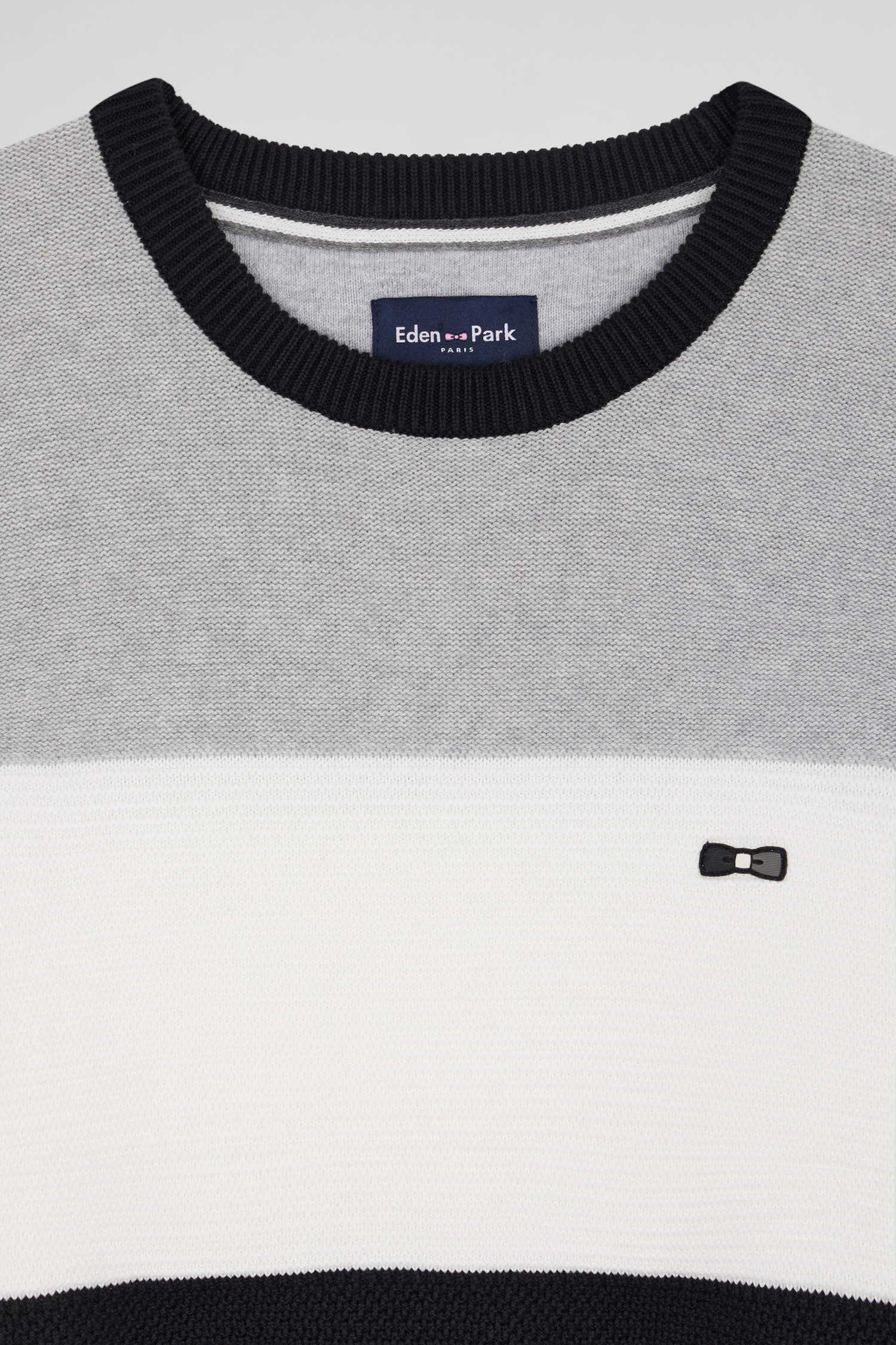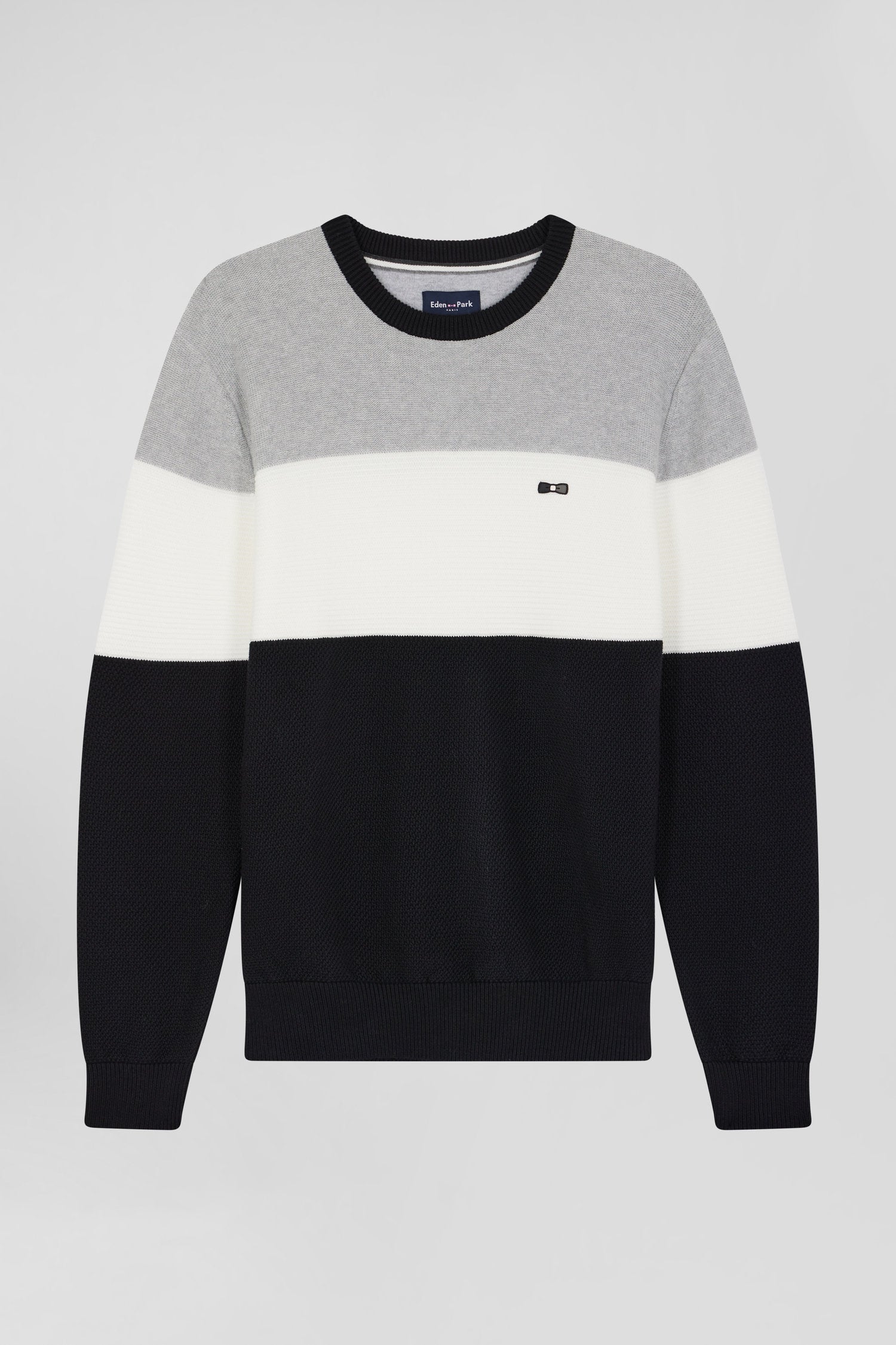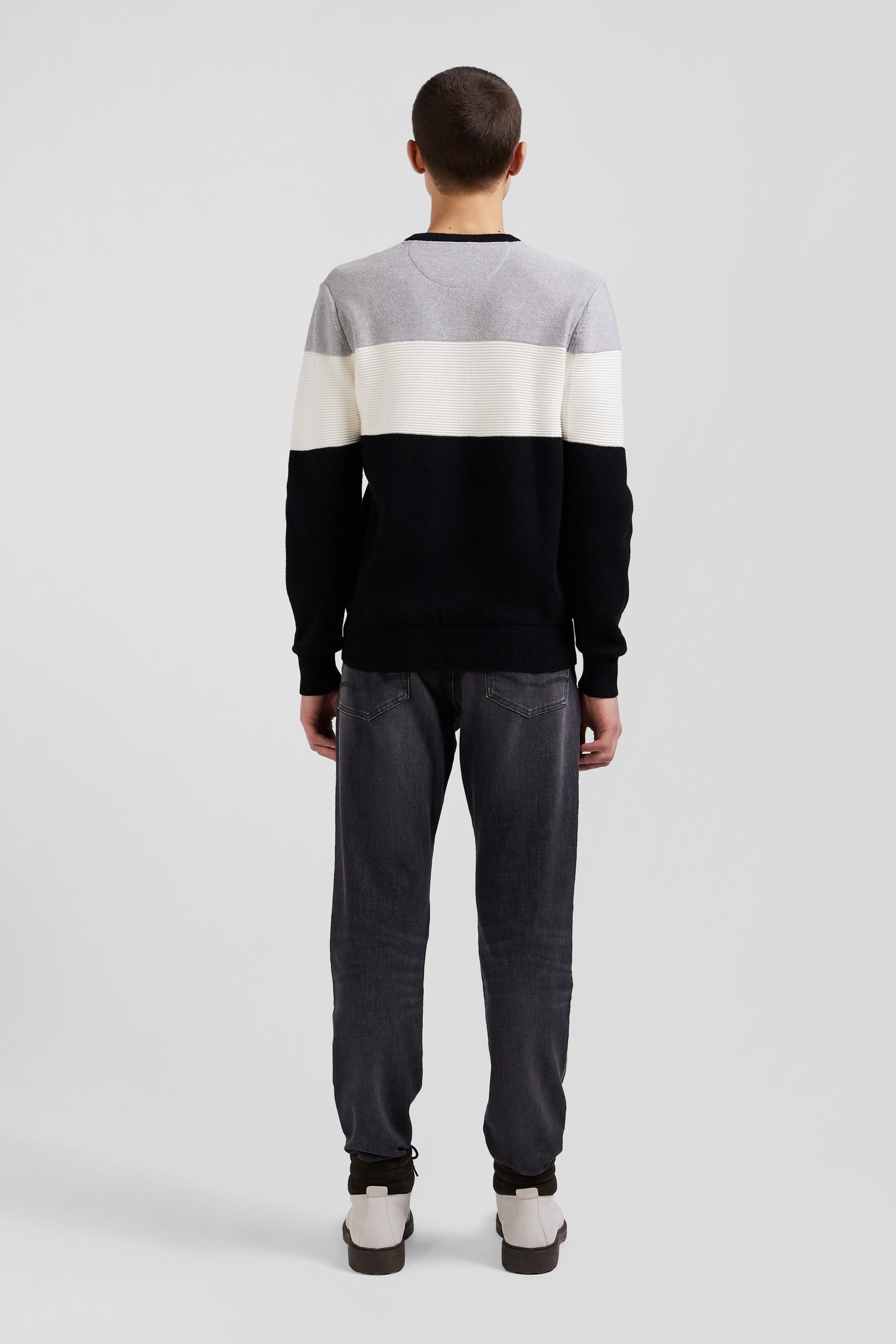 Pull col rond en coton gris et blanc à jeux de maille coupe Regular