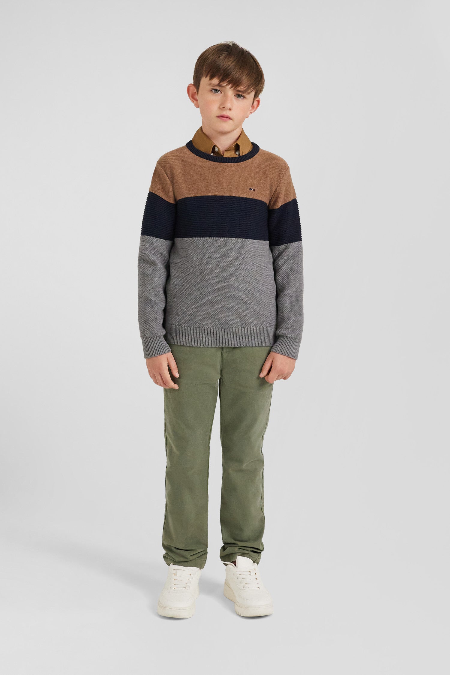 Égayez le vestiaire automne-hiver de votre enfant avec ce pull en coton à col rond. Facile à enfiler et à associer, ce pull en fibre de coton douce et durable offre un confort exceptionnel tout au long de la journée. Idéal pour les aventures quotidiennes, ce pull tricolore se dote de notre emblématique broderie nœud papillon dans sa version tricolore.