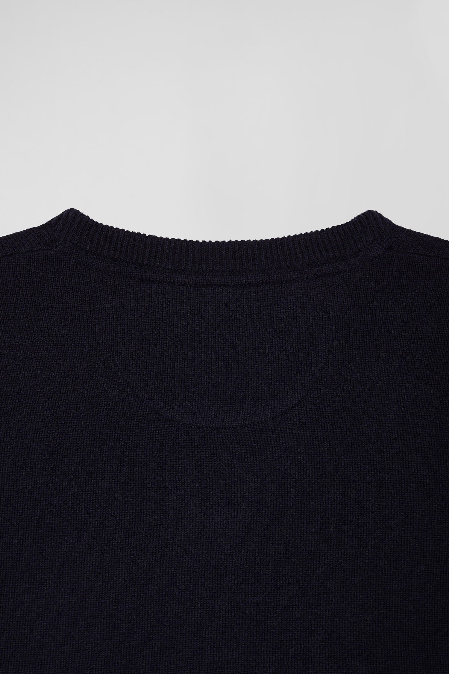 Pull col V en laine et coton bleu marine demi-lune cerclée coupe Regular