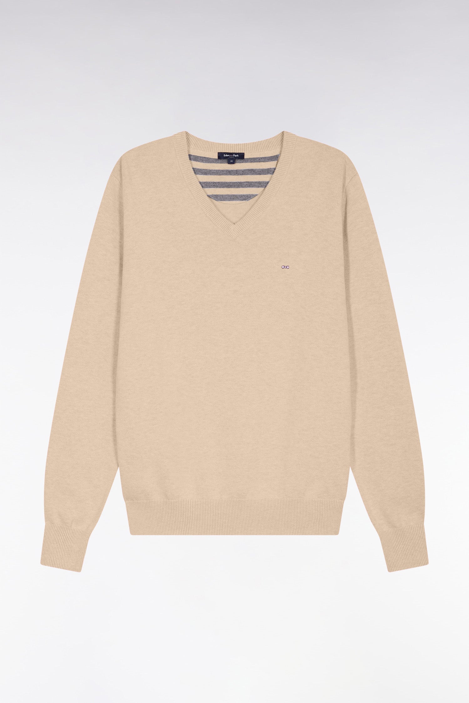 Cet élégant pull col V en laine et coton mélangés reprend la coupe droite confortable et polyvalente de notre pull classique décliné dans plusieurs propositions se distinguant par leur encolure. Ce modèle se pare de notre emblématique broderie nœud papillon sur la poitrine et d'une demi-lune intérieure à rayures rugby. Parfait pour dynamiser une silhouette avec une touche de couleur maîtrisée grâce au large choix de coloris proposés ici