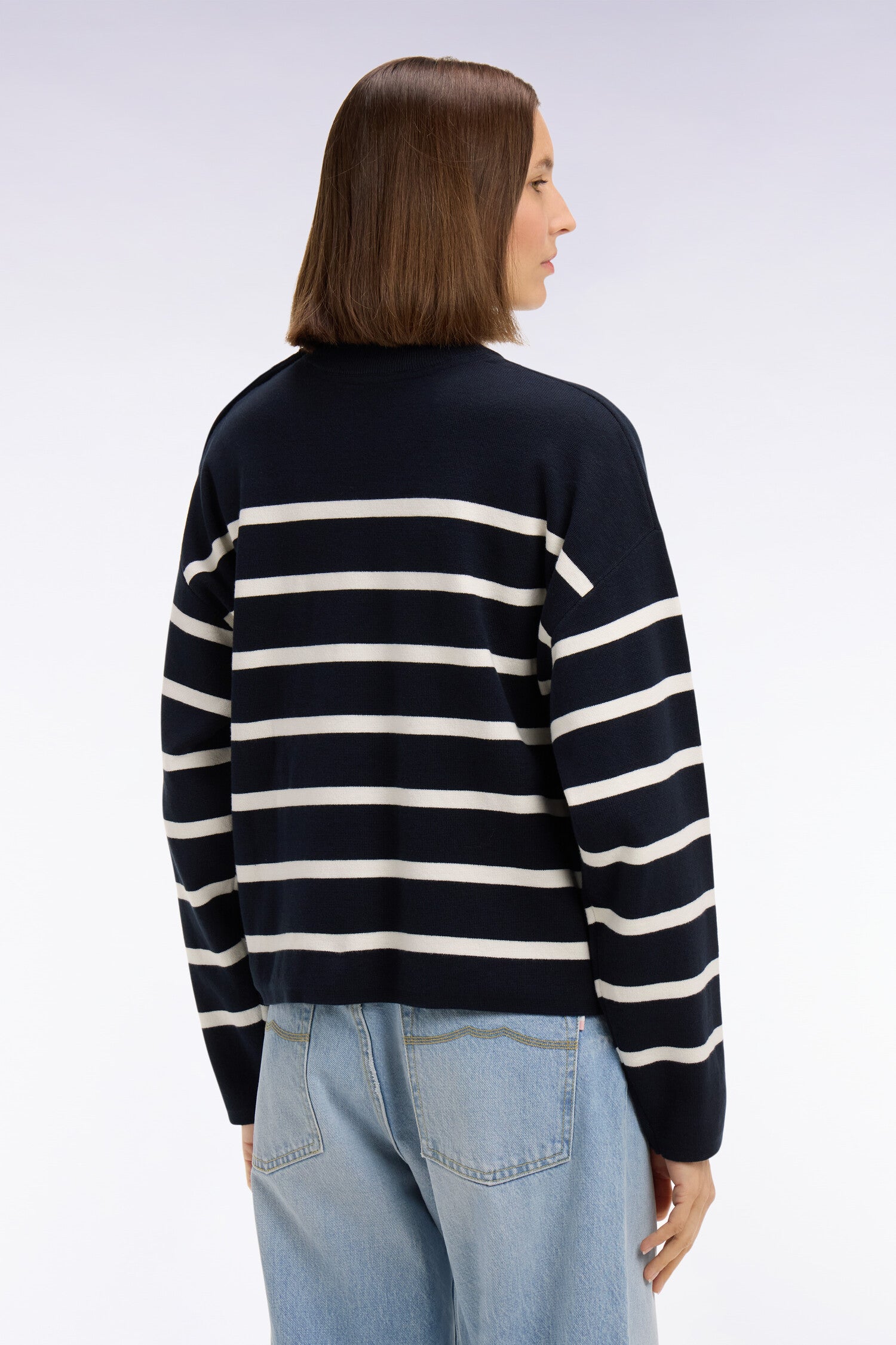 Ce pull marinière confectionné en maille milano pour un tomber plus dense et élégant offre une allure graphique contemporaine. Son ouverture d’épaule fermée par des boutons personnalisés Eden Park apporte une touche féminine et moderne, tandis que le nœud papillon brodé signe ce pull femme avec discrétion. Parfaite avec un short en denim ou un petit short en milano marine coordonné, cette marinière compose des looks d’été chic et structurés. Un intemporel facile à coordonner à vos favoris qui enrichira durablement votre vestiaire printemps été grâce à la qualité de sa confection et à son allure soignée.