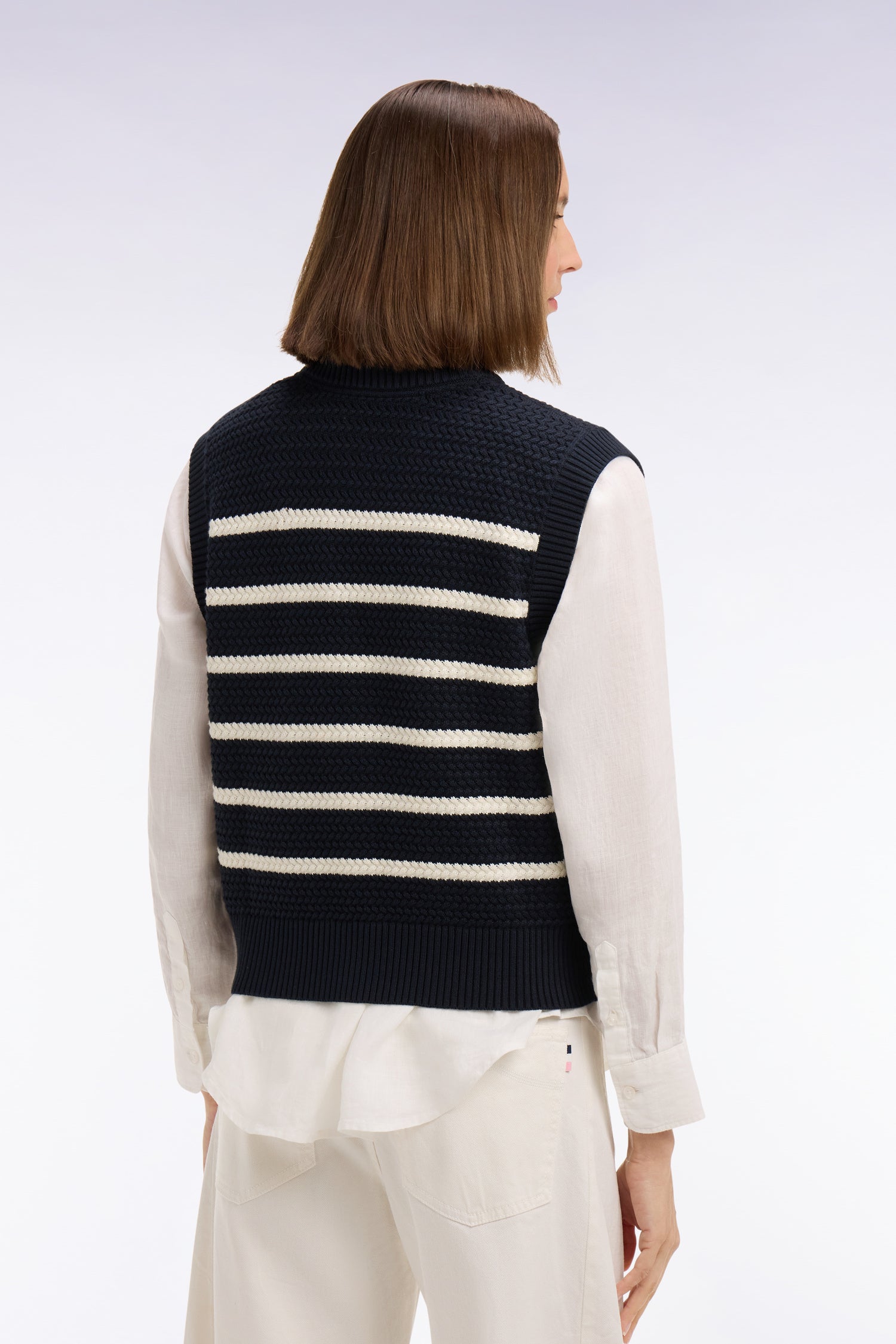 Ce pull rayé sans manches en maille tressée décline l’esprit balnéaire de la marinière dans une version féminine et contemporaine. Sa texture riche et son col rond épuré en font une pièce idéale pour l’été. Proposé en beige ou en marine, il se porte parfaitement sous le cardigan assorti porté ouvert pour un twin-set coordonné chic, ou seul sur un pantalon à jambes larges pour une allure effortless de la ville à la plage.