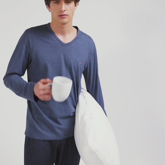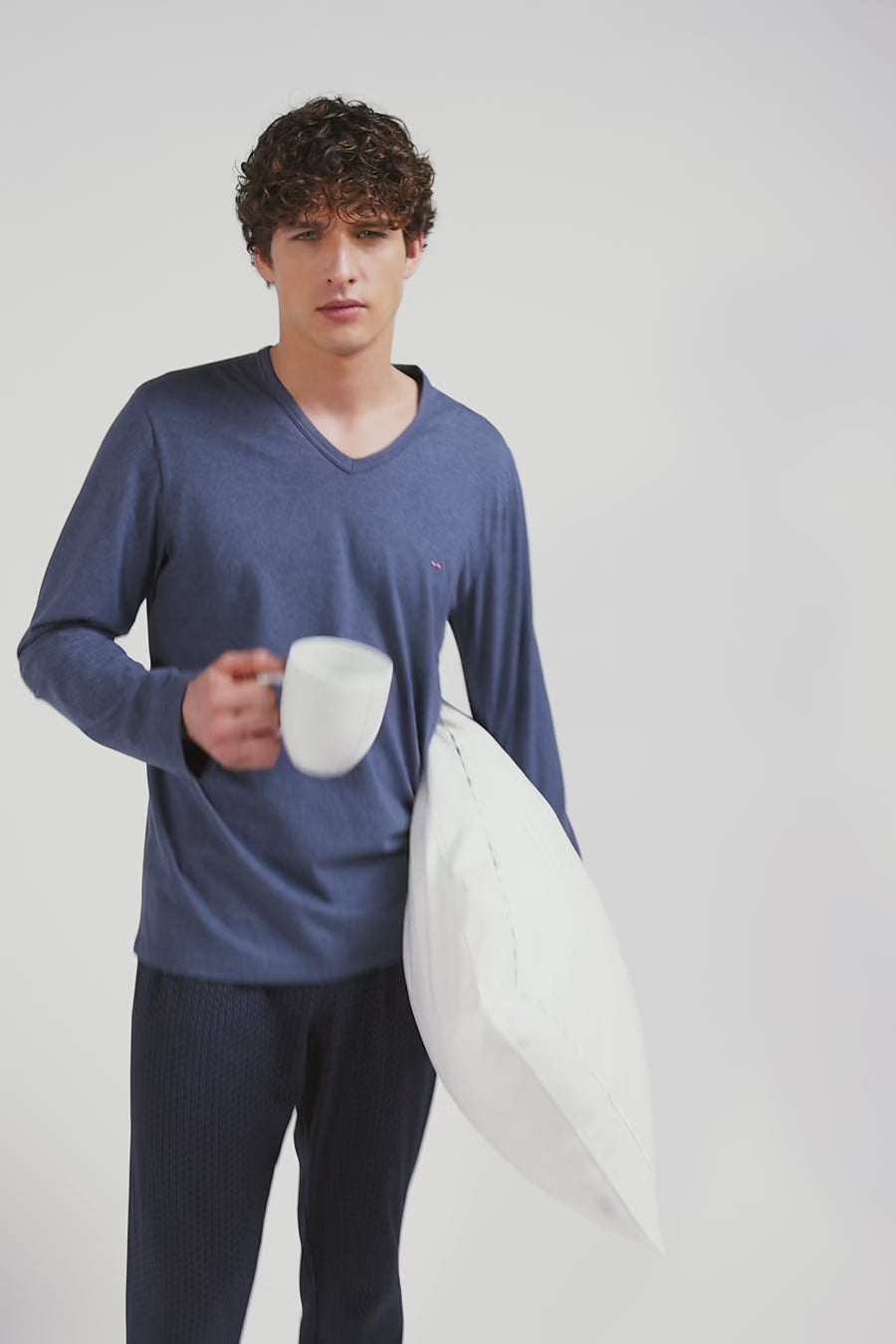Pyjama long en coton bleu foncé pantalon à micromotifs nœuds papillon