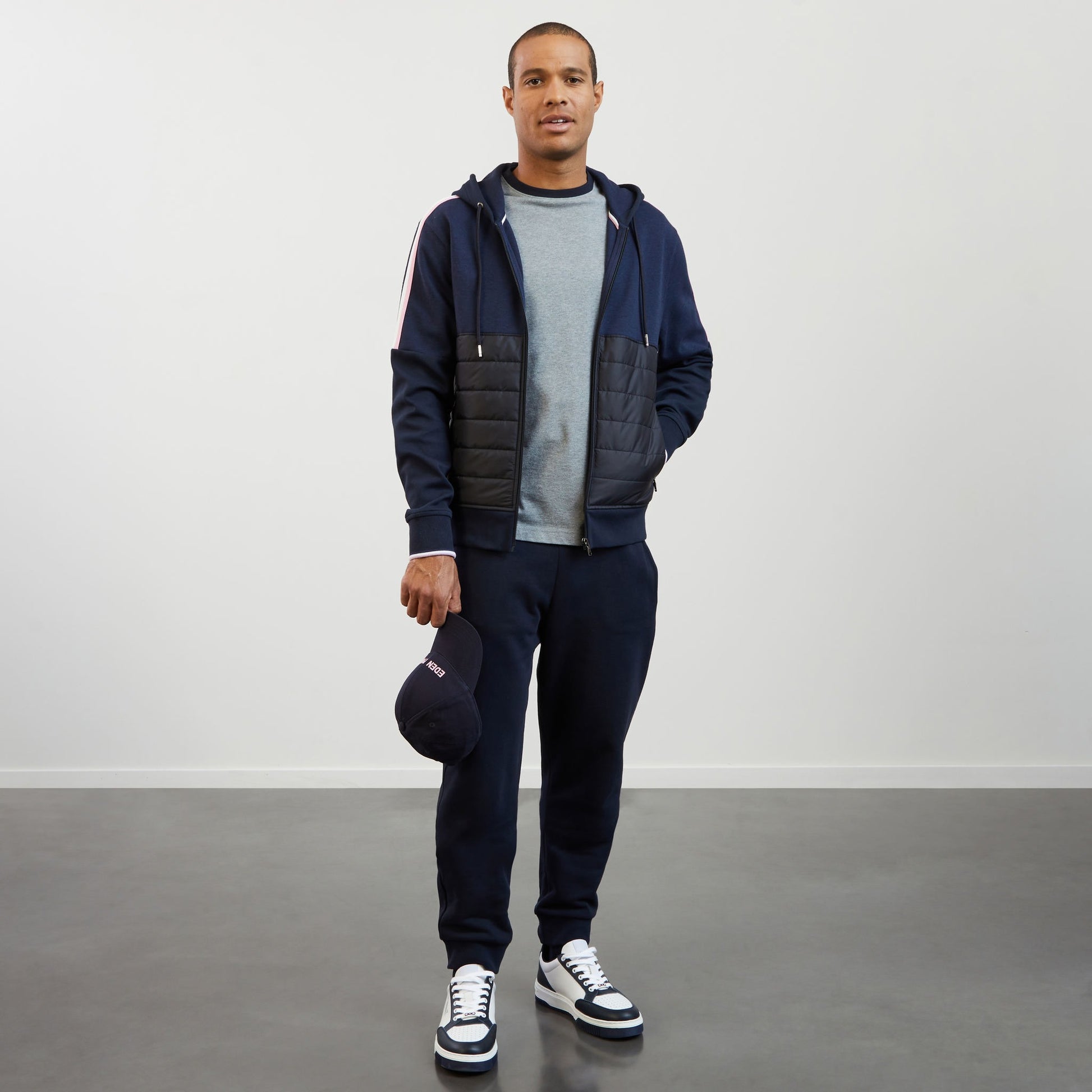 Ce sweat à capuche garantit confort et résistance grâce à sa confection en coton épais avec des empiècements déperlants sur le devant. Il est doté d'une fermeture et de poches zippées et affiche un badge logo écusson sur la poitrine. On note les bandes tricolores au niveau des épaules et le haut des manches