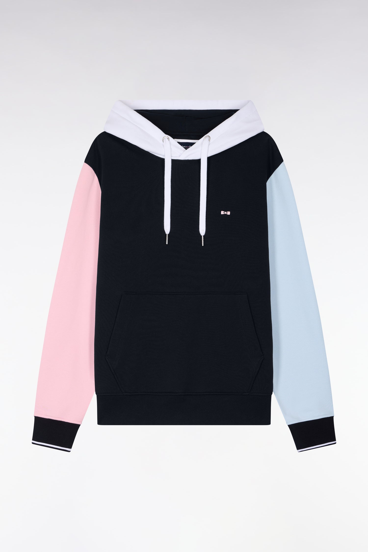 Ce sweatshirt à capuche en molleton coton doux revisite les classiques du vestiaire de notre Maison avec ses finitions précises s'amusant des associations de couleurs : capuche blanche doublée marine, manches bicolores rose et ciel, nos coloris de prédilection sans oublier ses finitions bords-côtes rayés aux poignets et l'inimitable broderie nœud papillon Eden Park sur la poitrine. Au dos, ce sweatshirt à capuche révèle une broderie identitaire rehaussée de notre tissu cravate ton sur ton. Son allure dynamique et ses découpes nettes en font un modèle résolument contemporain à porter avec le short en molleton coordonné, rappel de ses manches bicolores.