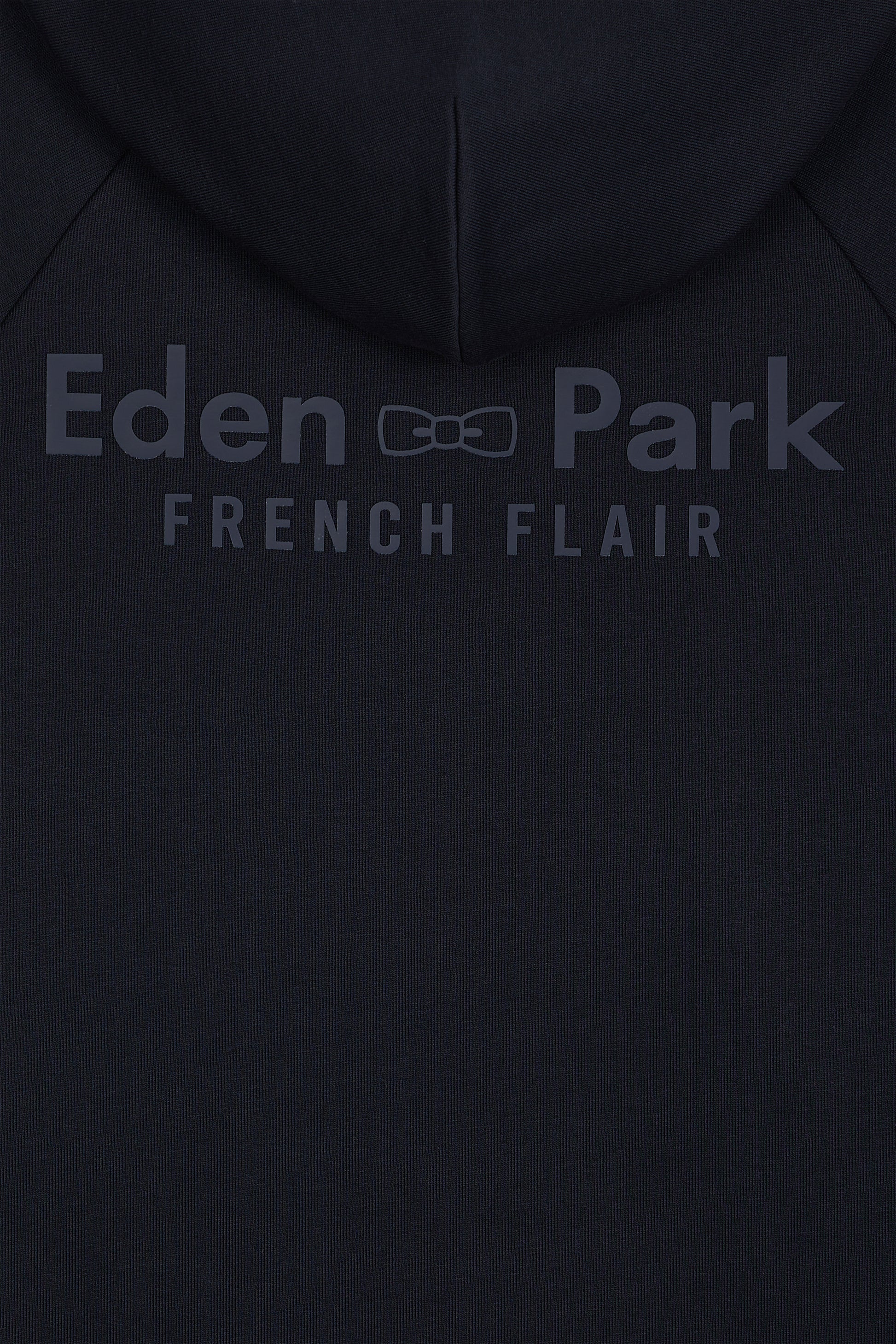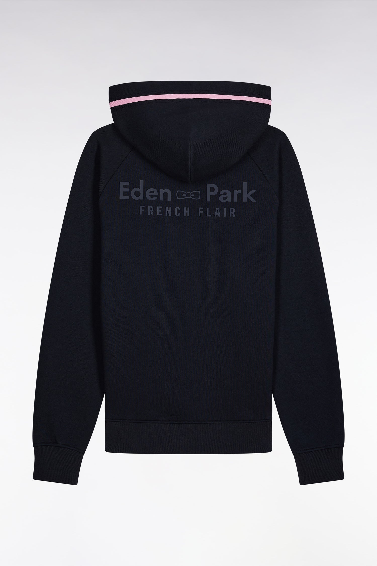 Ce sweatshirt à capuche semi-zippé façon col camionneur s’impose par son style affirmé et son jersey lourd au tombé impeccable. Les fentes latérales, rehaussées d’un ruban tricoté rayé, apportent une touche graphique, tout comme le contour de capuche contrasté. Une impression ton sur ton au dos signe la pièce avec caractère. Le cordon personnalisé au logo Eden Park et les finitions métalliques parachèvent ce modèle au style urbain des plus tendance offert dans une coupe ample