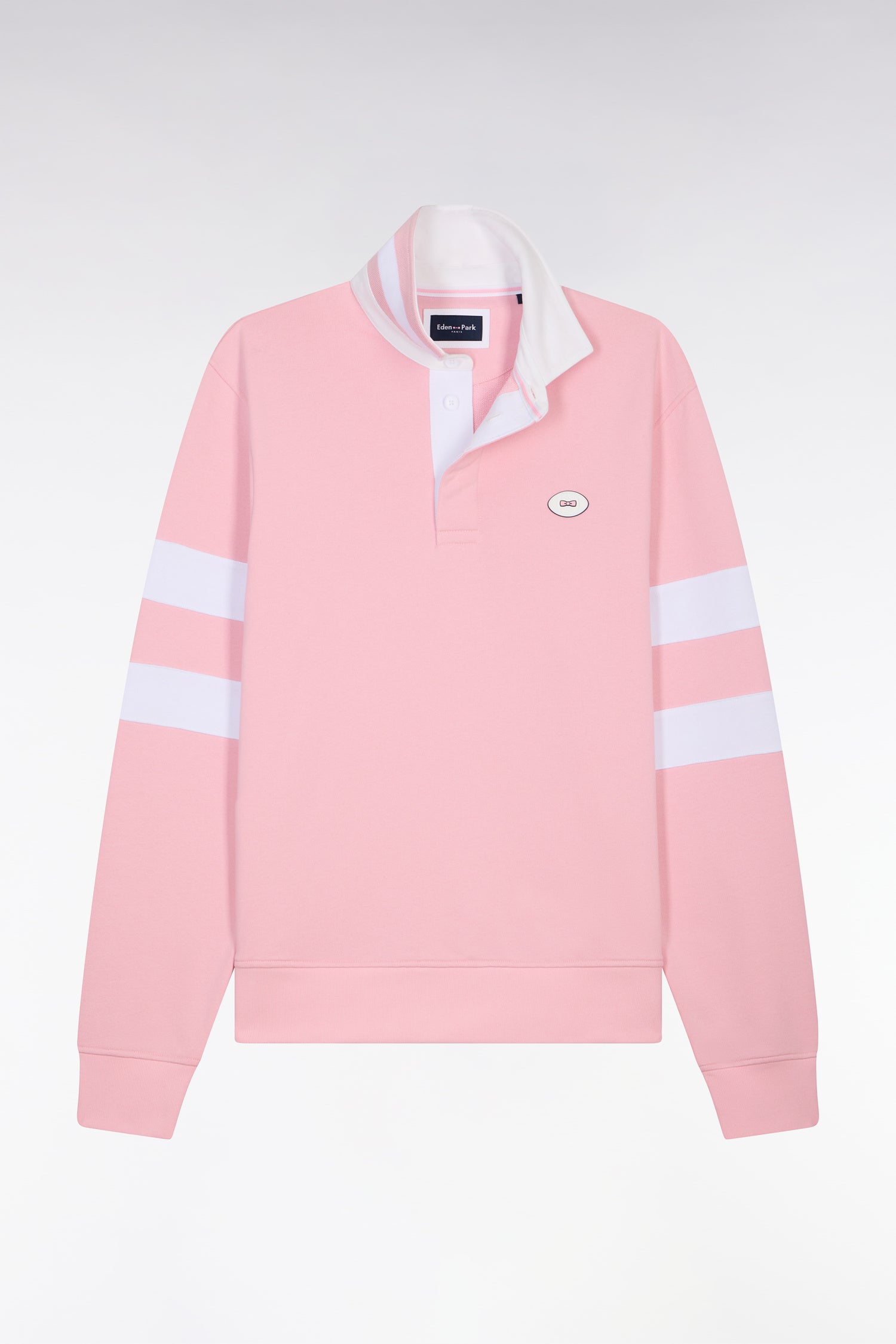 Ce sweatshirt homme revisite l’iconique maillot de rugby dans une version contemporaine adapté à l'extérieur du terrain. Le col maillot contrasté à dessous de col rayé, les bandes découpées bicolores sur les manches et le badge poitrine signent une silhouette sport chic lumineuse. Confectionné dans un molleton doux, ce sweatshirt apporte une touche preppy idéale pour les looks décontractés de mi-saison. Un modèle intemporel masculin offert en ciel, rose ou marine. À Porter avec un jean ou son short en molleton pour un total look d'inspiration retour de l'entrainement.
