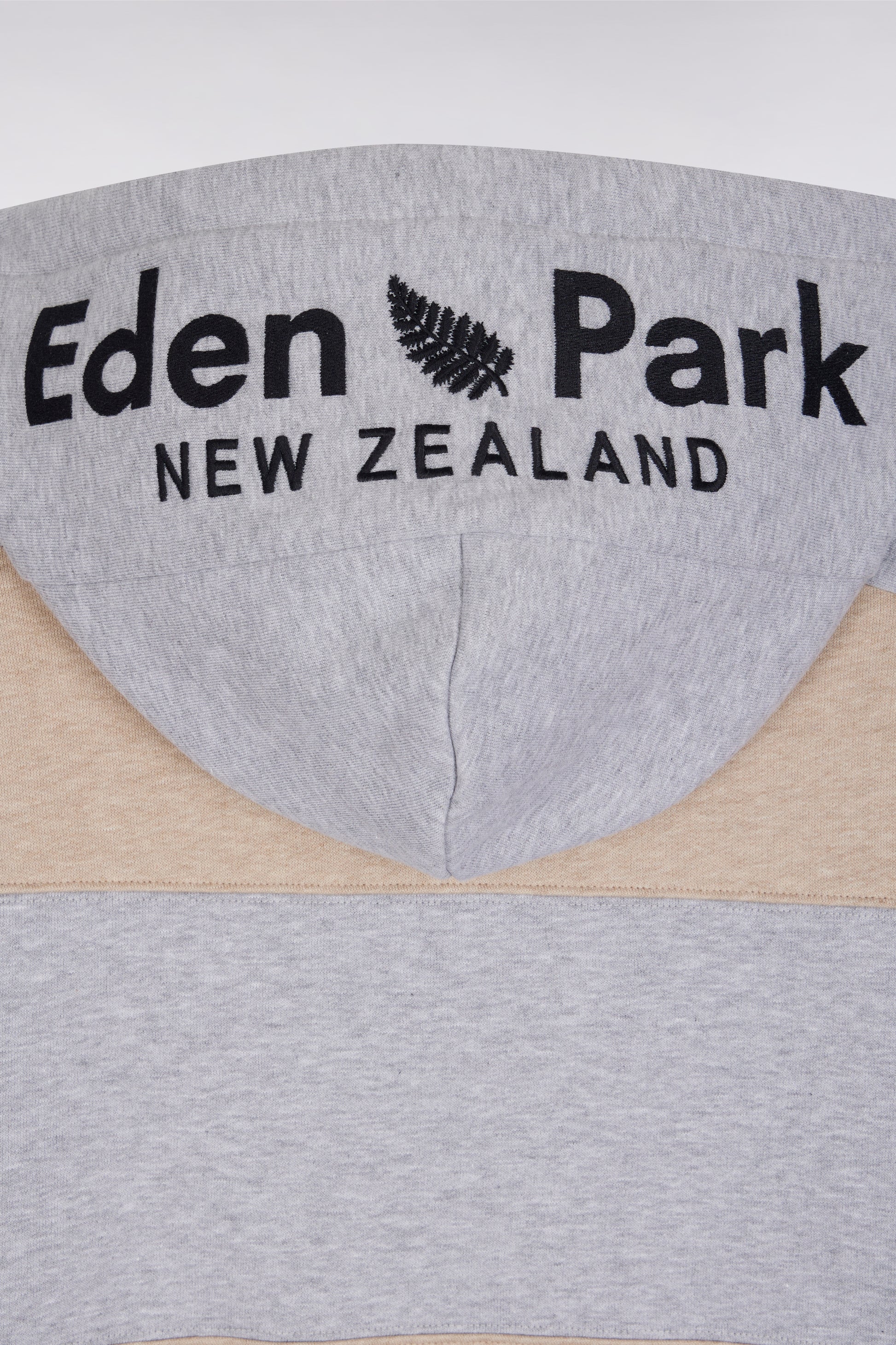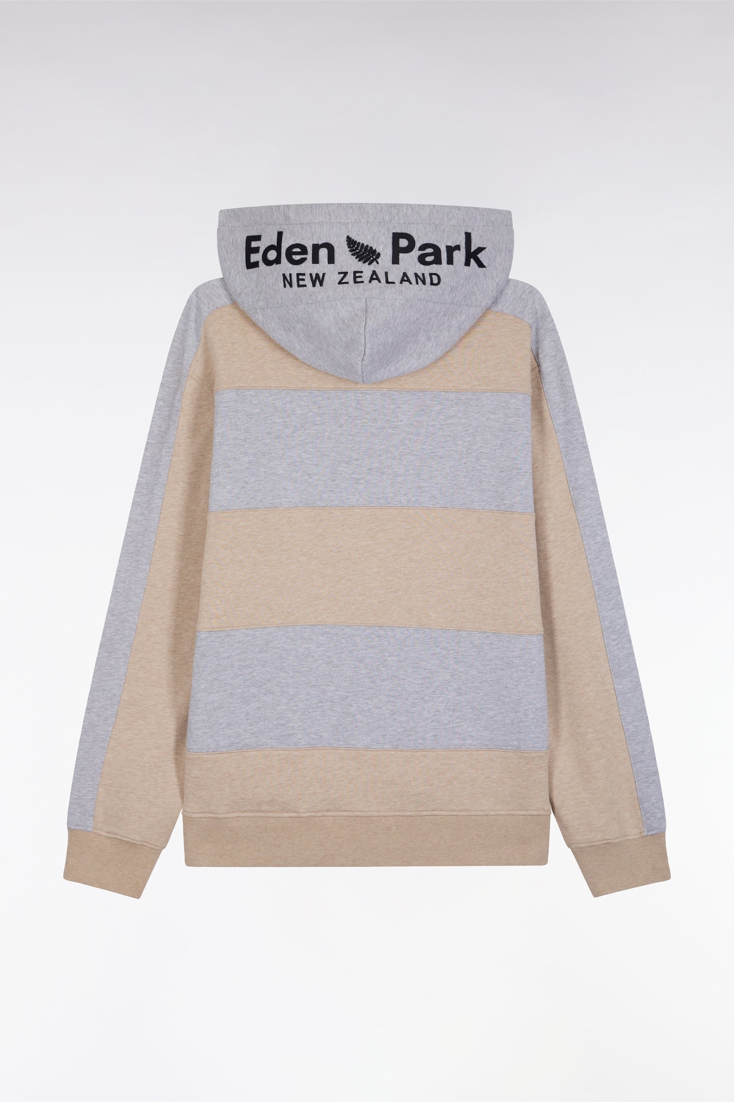 Pièce forte du vestiaire décontracté, ce sweatshirt à capuche rend hommage à la Nouvelle-Zélande, terre emblématique du rugby. Décliné en 2 associations, beige et gris clair ou noir et gris foncé, il s’inspire du maillot de rugby à bandes pour une silhouette graphique. Broderie numéro 10, écusson emblématique et cordons siglés viennent affirmer l’ADN Eden Park