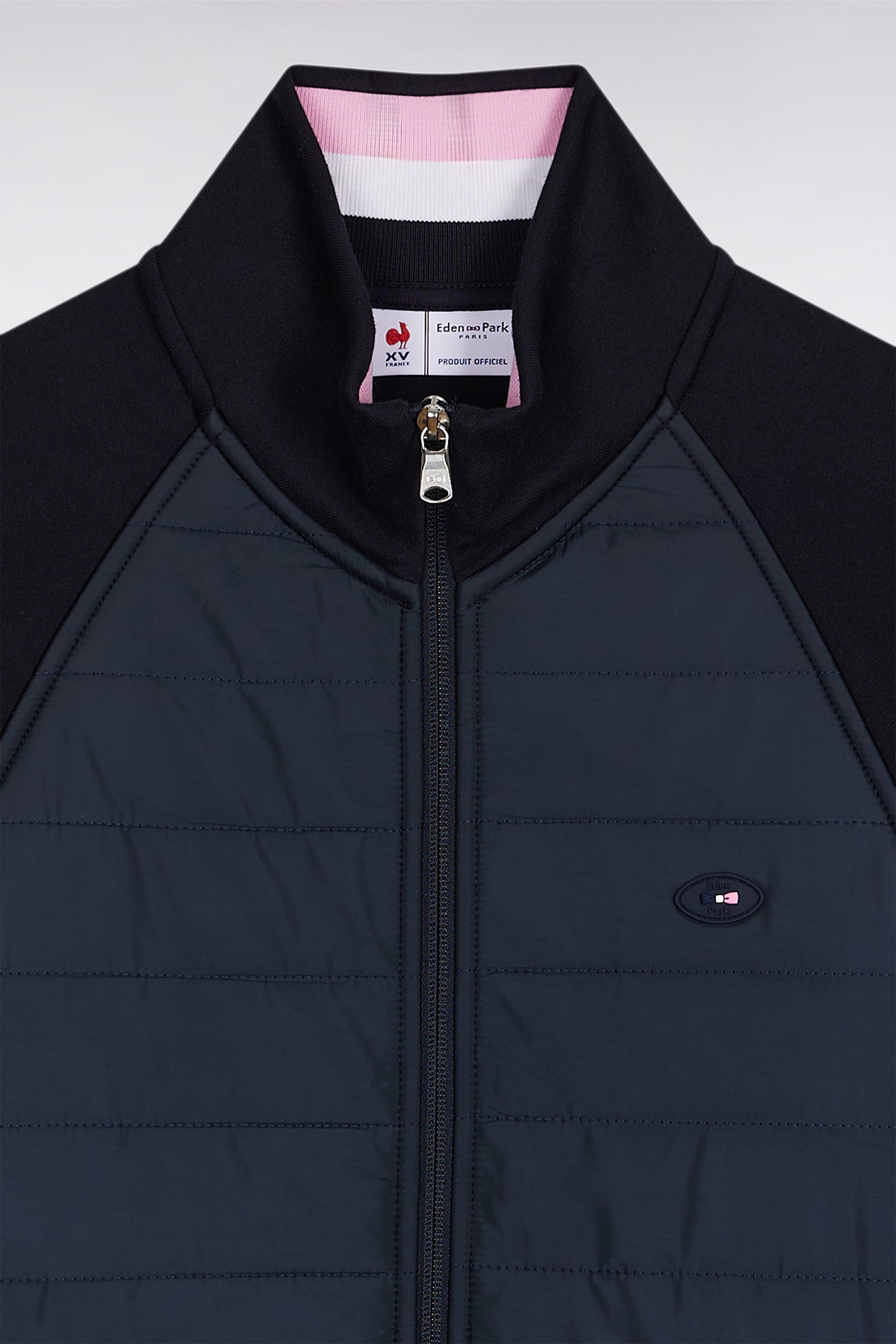 Pensé en collaboration avec la Fédération Française de Rugby (FFR), ce sweatshirt zippé allie esprit sportif et finitions haut de gamme. Conçu comme une veste légère, il se distingue par une parementure poitrine en nylon matelassé qui structure la silhouette. Confortable et protecteur, ce sweatshirt zippé bimatière se porte dès la mi-saison, pour affirmer une allure athlétique et élégante. Broderies officielles, badge FFR et détails tricolores signent cette pièce emblématique à porter bien au-delà du terrain pour une silhouette urbaine aux accents sportifs