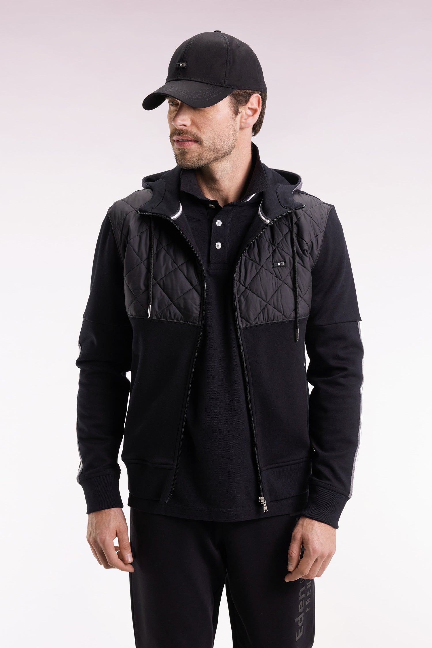 Sweatshirt zippé en interlock bimatière matelassé noir et gris