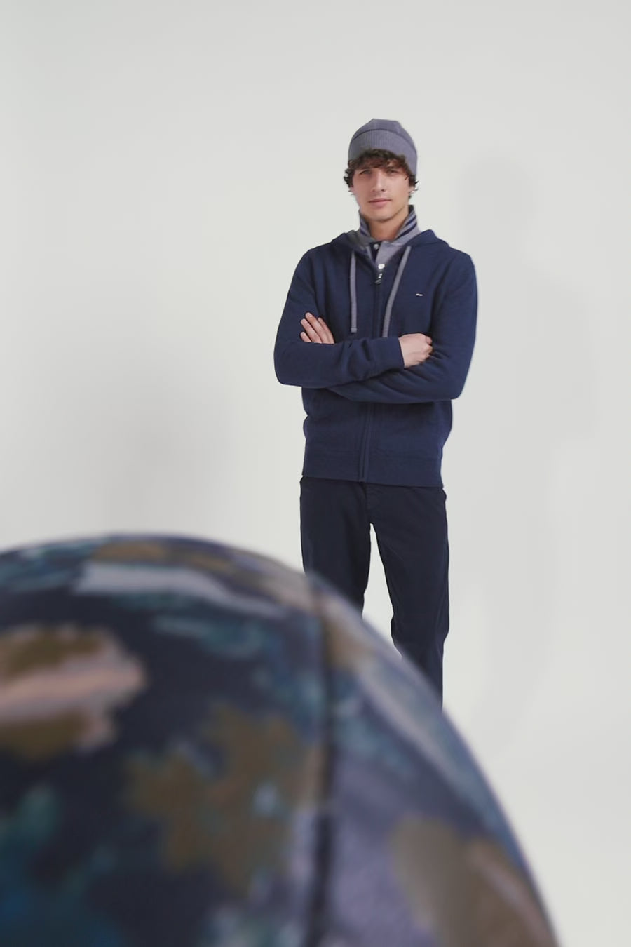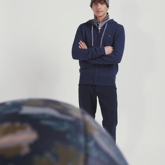 Sweatshirt zippé en maille laine et coton bleu marine coupe Regular