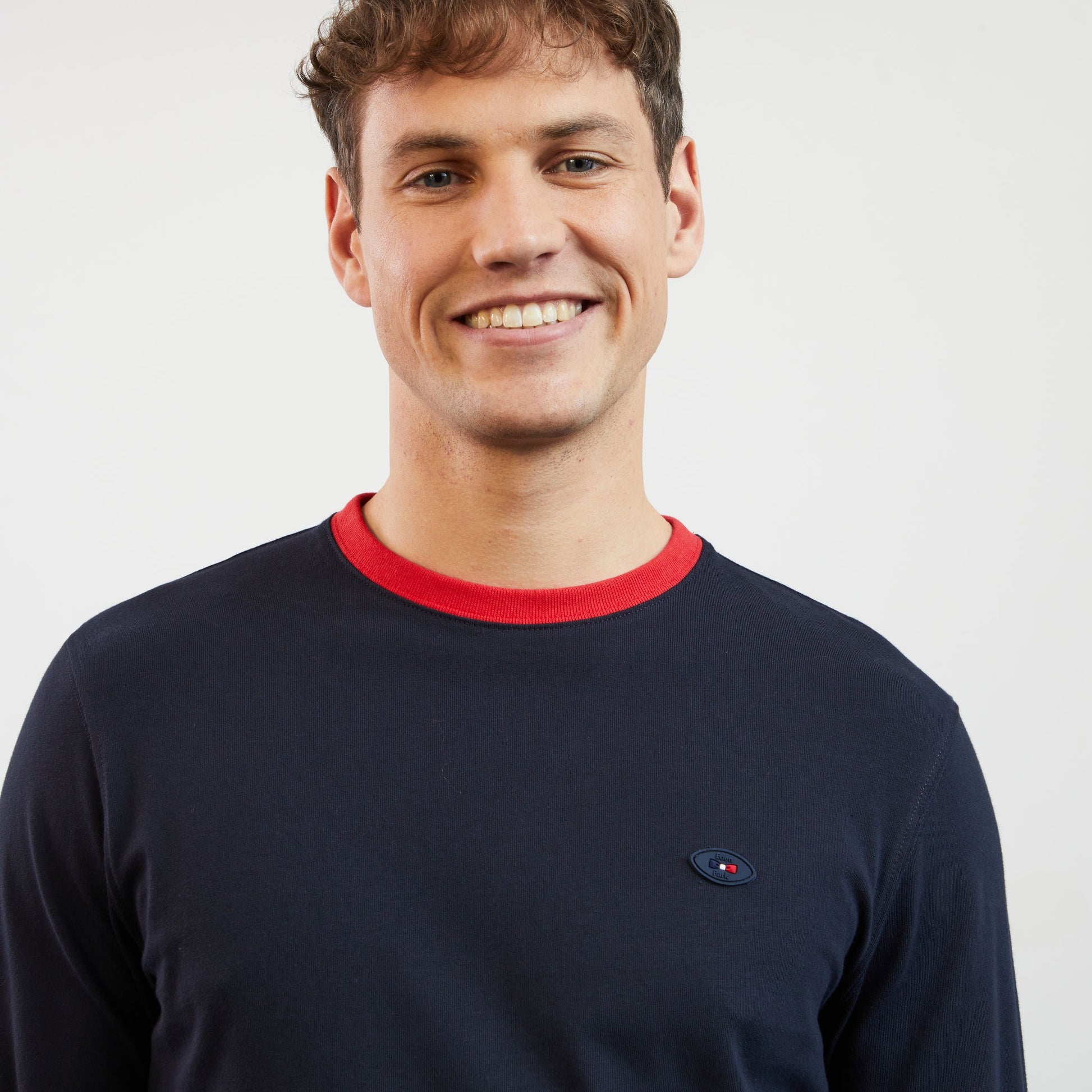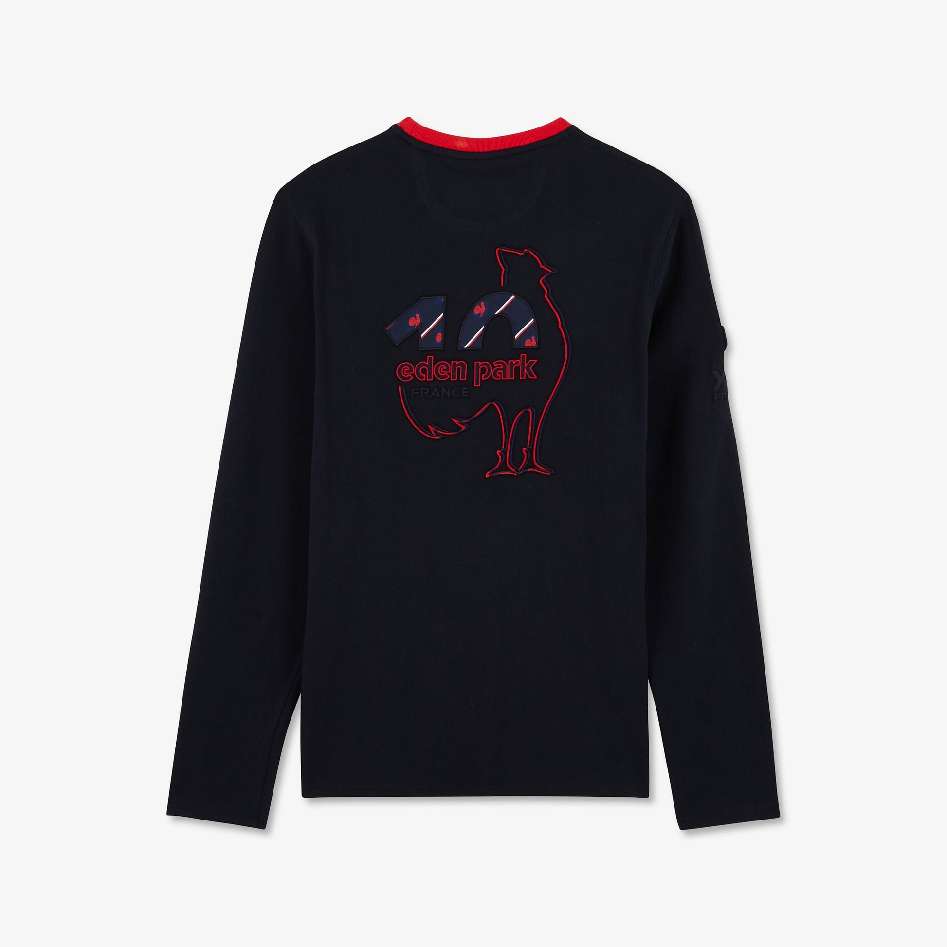 Conçu en jersey de coton, ce t-shirt à manches longues présente une belle broderie n°10 Eden Park tricolore au dos, ainsi qu'une autre du XV de France sur la manche droite décorée d'un écusson coq en silicone. Il affiche notamment un logo en silicone en forme de ballon de rugby placé à la poitrine