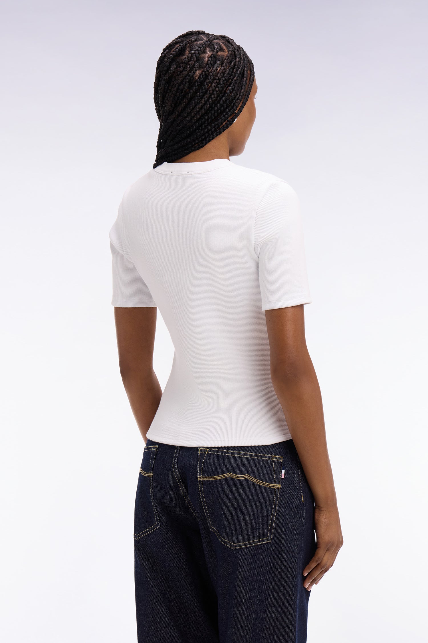 Ce T-shirt femme encolure ronde à la coupe slim ajustée est confectionné en modal et coton pour vous offrir un toucher naturellement doux et confortable. Son tricotage côtelé met subtilement en valeur la silhouette, tandis que le nœud papillon rose brodé sur la poitrine signe cet intemporel avec discrétion. À porter sous une chemise ouverte, glisser dans un jean taille haute ou à associer à un cardigan léger pour une allure effortless chic en toutes occasions.