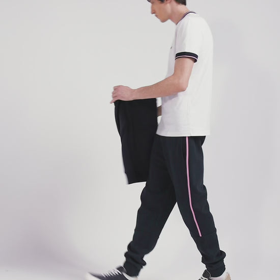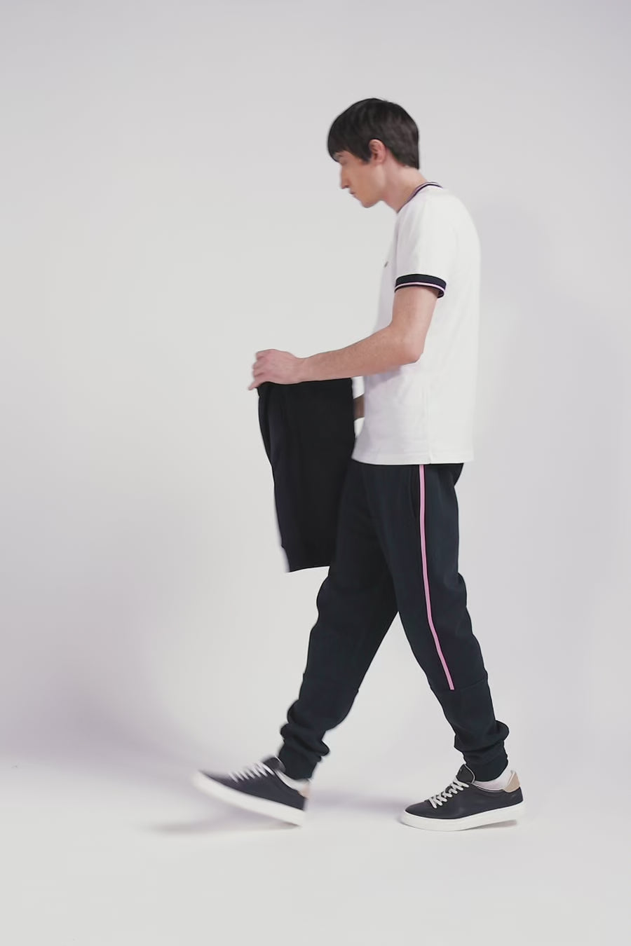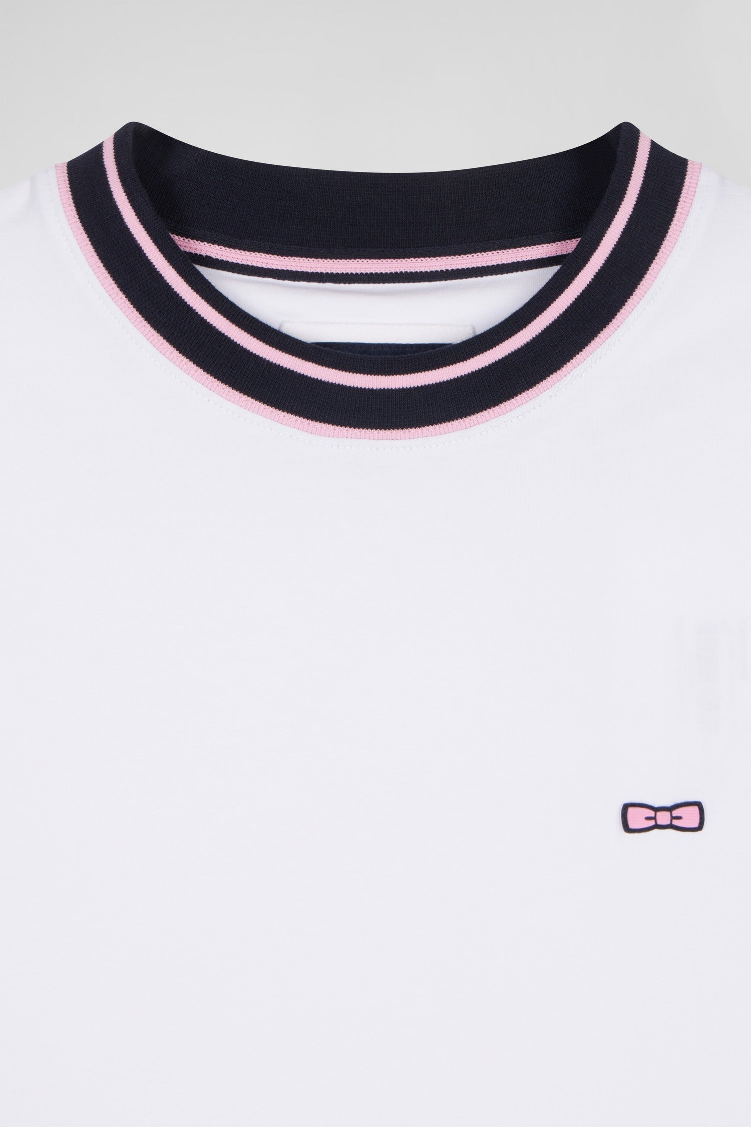 Pour une allure sportive, ce T-shirt en jersey de coton arbore sur ses manches courtes des bords-côtes rayés siglés au nom de notre Maison. Un rappel travaillé est apporté par son col rond contrasté et sa broderie poitrine nœud papillon rose.