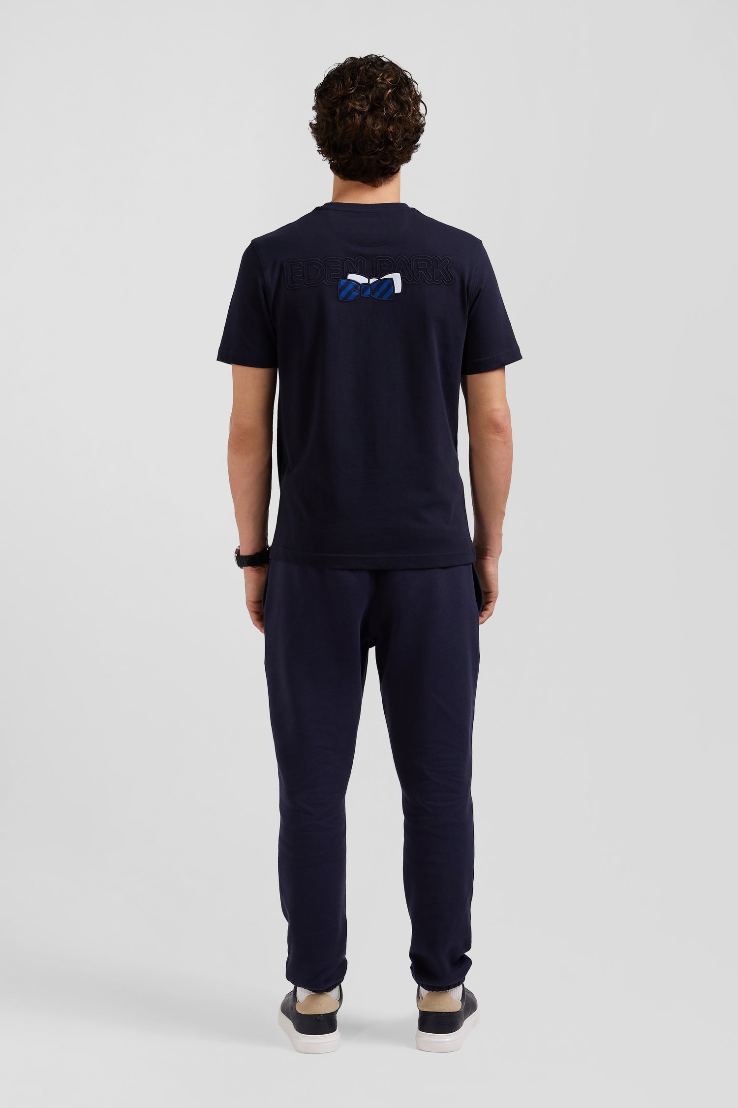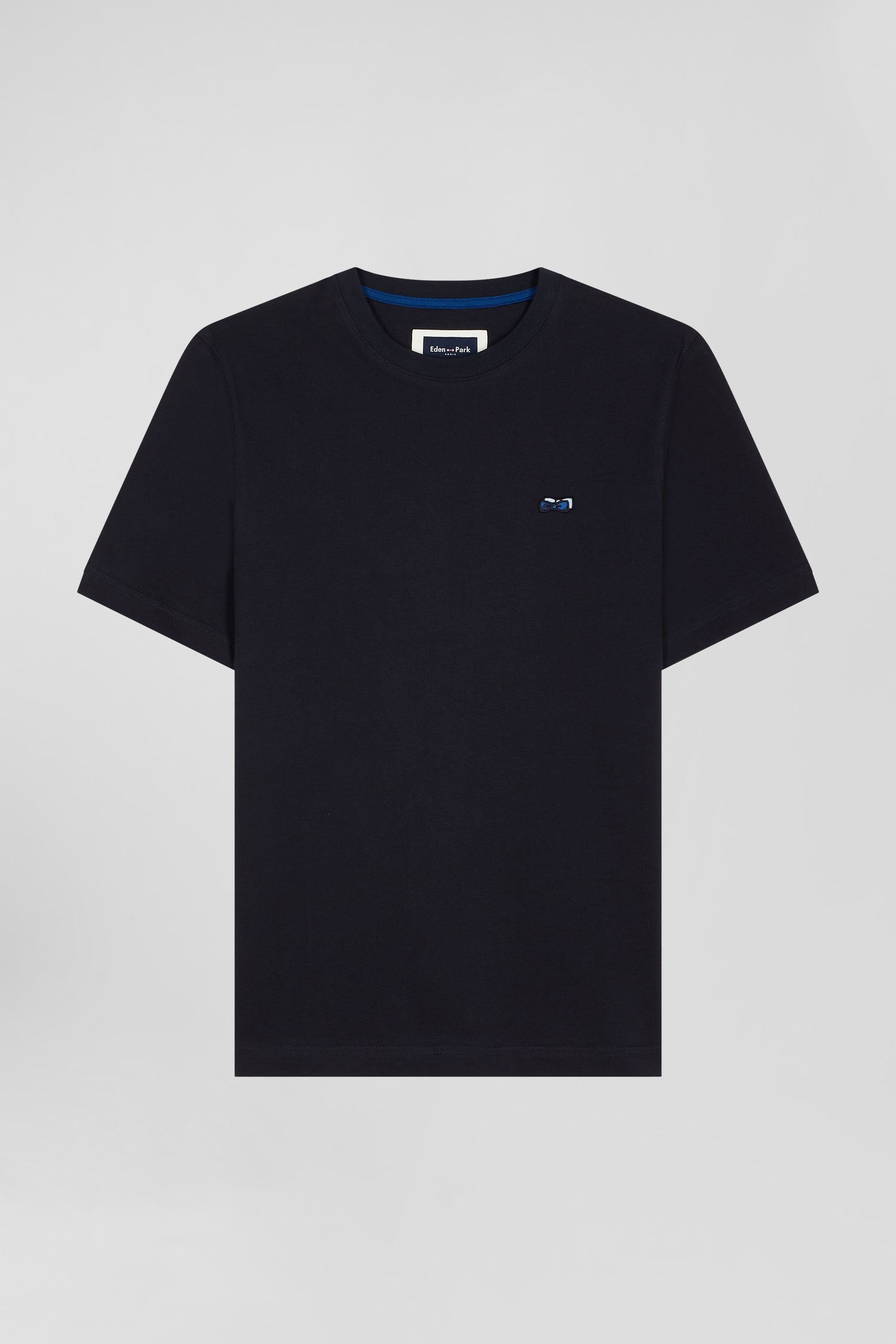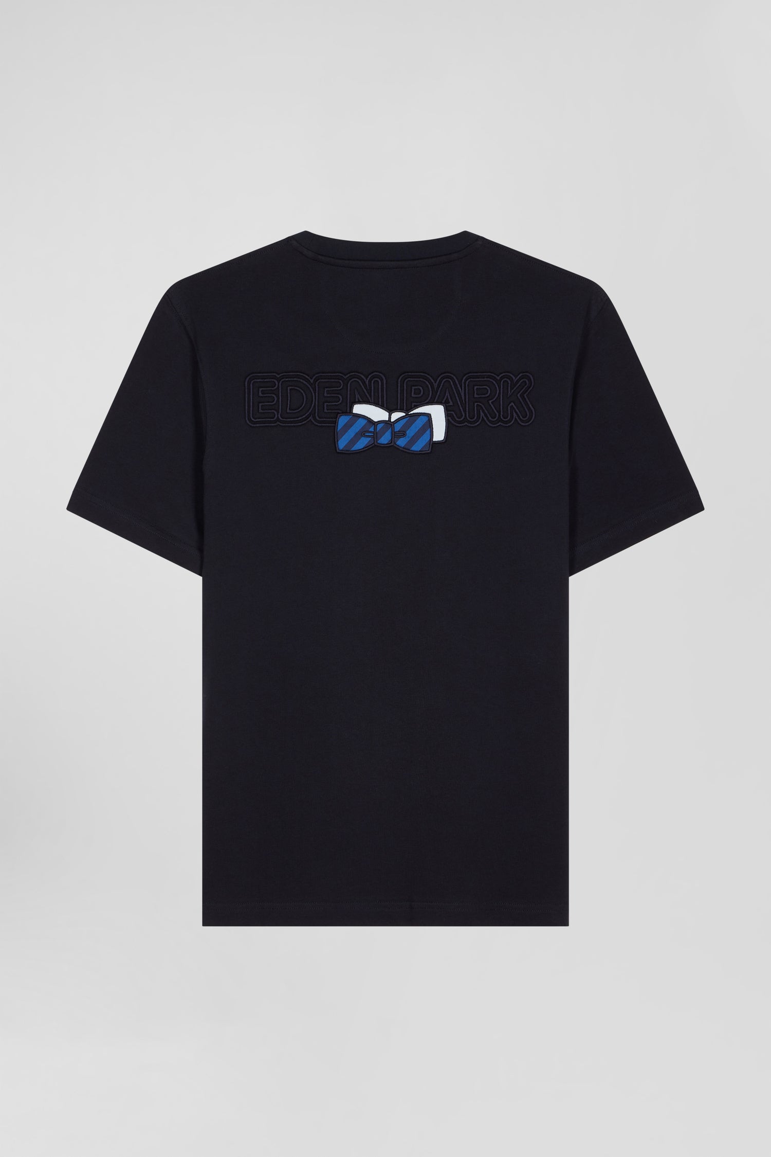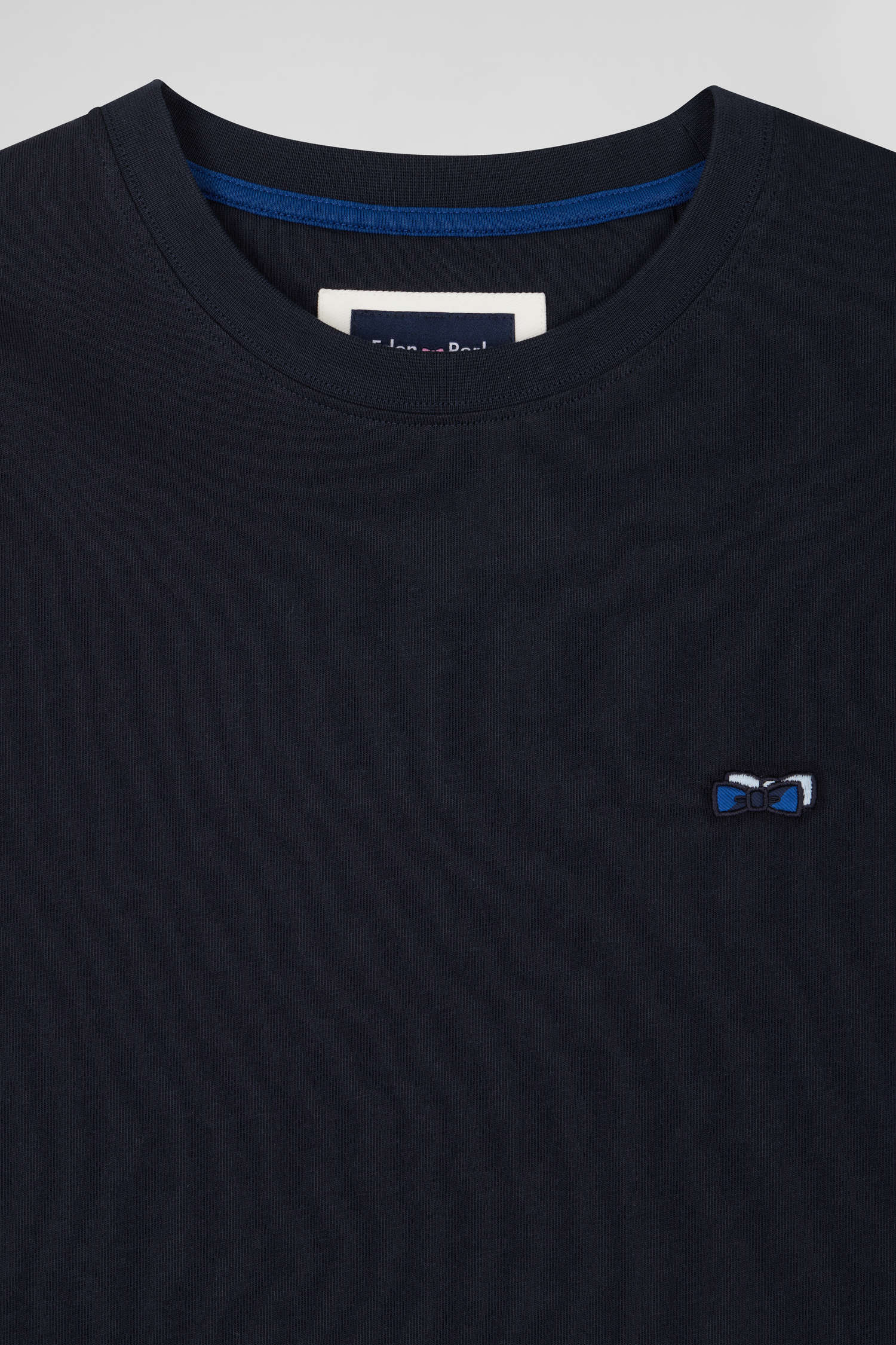 Ce T-shirt pour homme à col rond en jersey de coton doux et confortable dispose de toutes les finitions emblématiques du savoir-faire Eden Park. Notre emblématique nœud papillon y est présenté par l'application d'un tissus cravate cerclé ajouté à sa broderie dos.